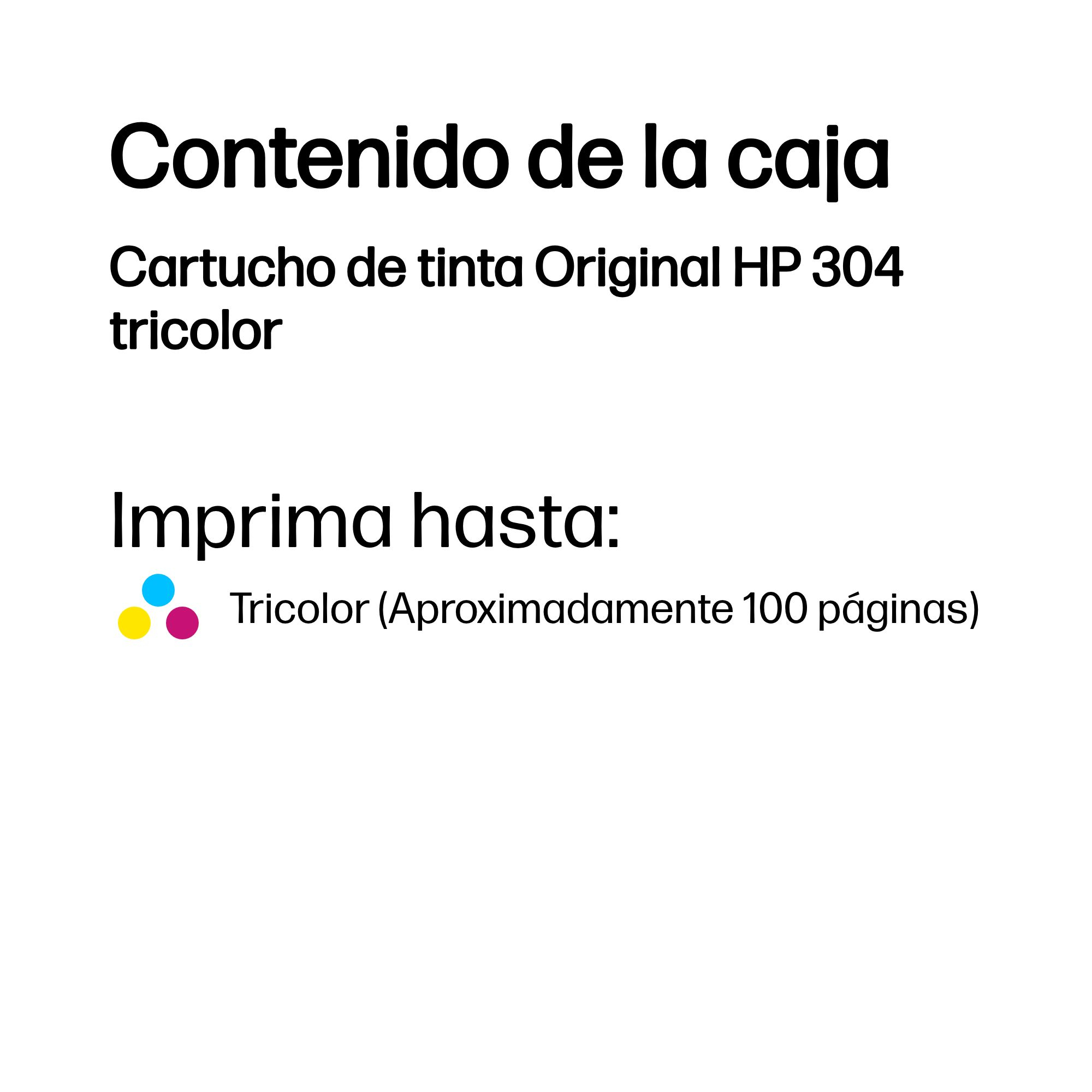 | Compatibilidad | Los cartuchos de Tinta HP 304 funcionan con: HP DeskJet 2620, 2622, 2630, 2632, 2633, 2634, 3720, 3750, 3760, 3762, 3764 HP Envy 5020, 5030, 5032 |