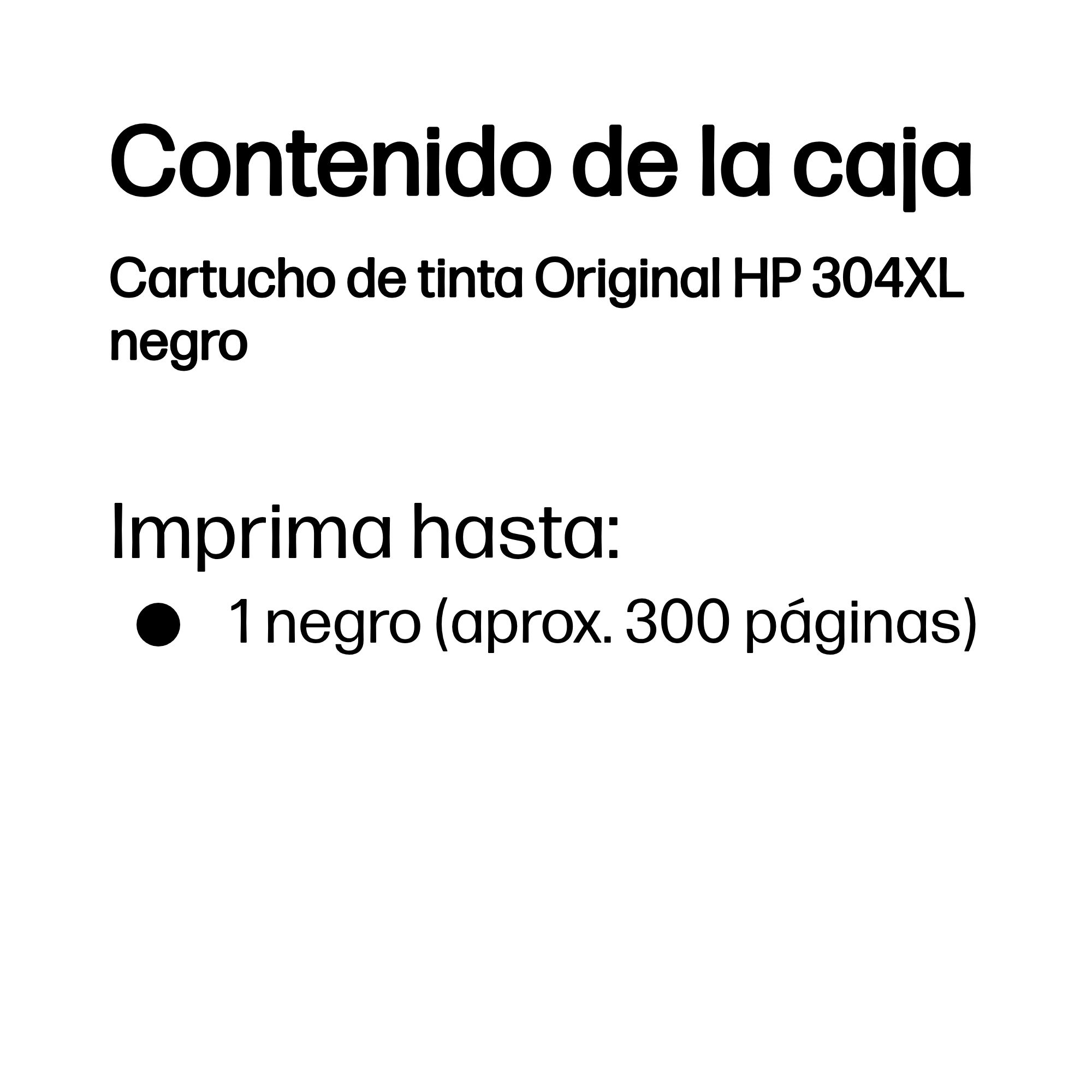 | Compatibilidad | Los cartuchos de Tinta HP 304 funcionan con: HP DeskJet 2620, 2622, 2630, 2632, 2633, 2634, 3720, 3750, 3760, 3762, 3764 HP Envy 5020, 5030, 5032 |