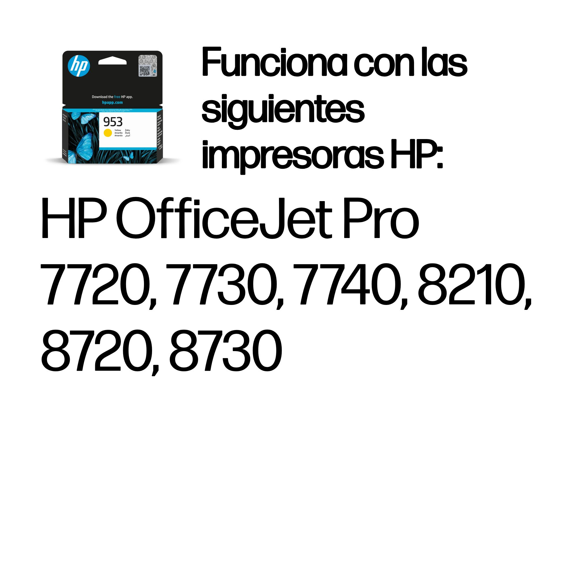 | Compatibilidad | Los cartuchos de Tinta HP 953 funcionan con: HP OfficeJet Pro 7720, 7730, 7740, 8210, 8720, 8730 |