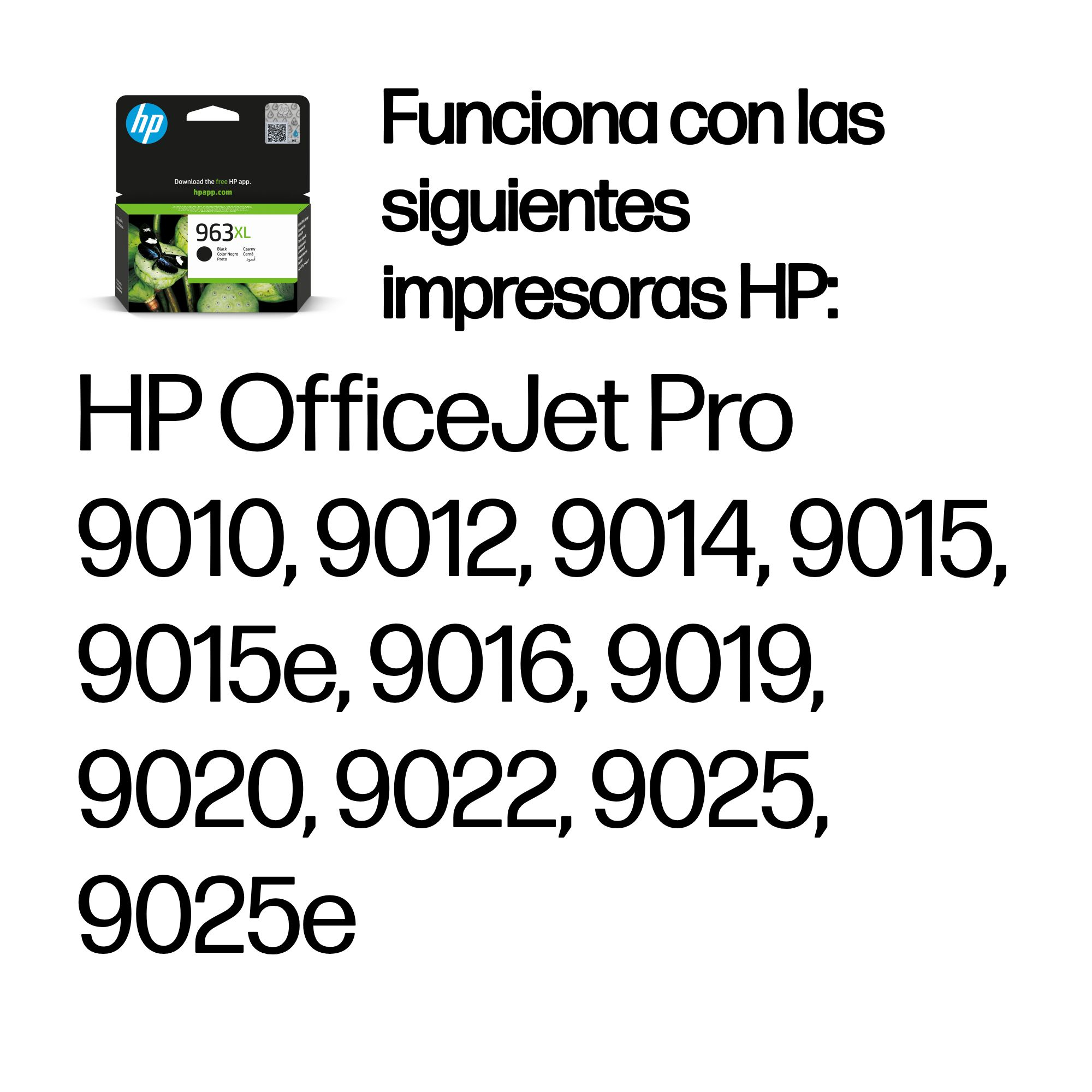 | Compatibilidad | Los cartuchos de Tinta HP 963 funcionan con: HP OfficeJet Pro 9010, 9012, 9014, 9015, 9015e, 9016, 9019, 9020, 9022, 9025, 9025e |