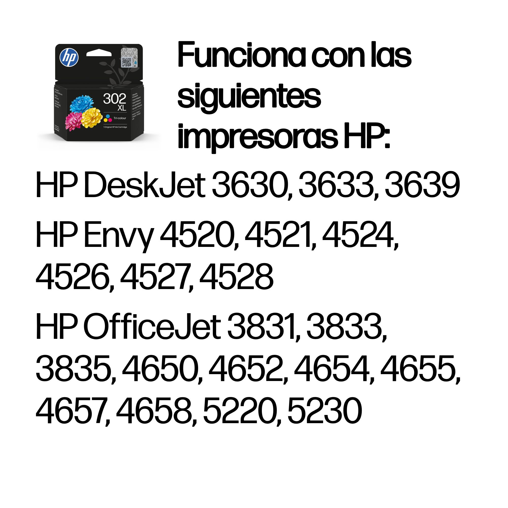 | Compatibilidad | Los cartuchos de Tinta HP 302 funcionan con: HP DeskJet 3630, 3633, 3639 HP Envy 4520, 4521, 4524, 4526, 4527, 4528 HP OfficeJet 3831, 3833, 3835, 4650, 4652, 4654, 4655, 4657, 4658, 5220, 5230 |