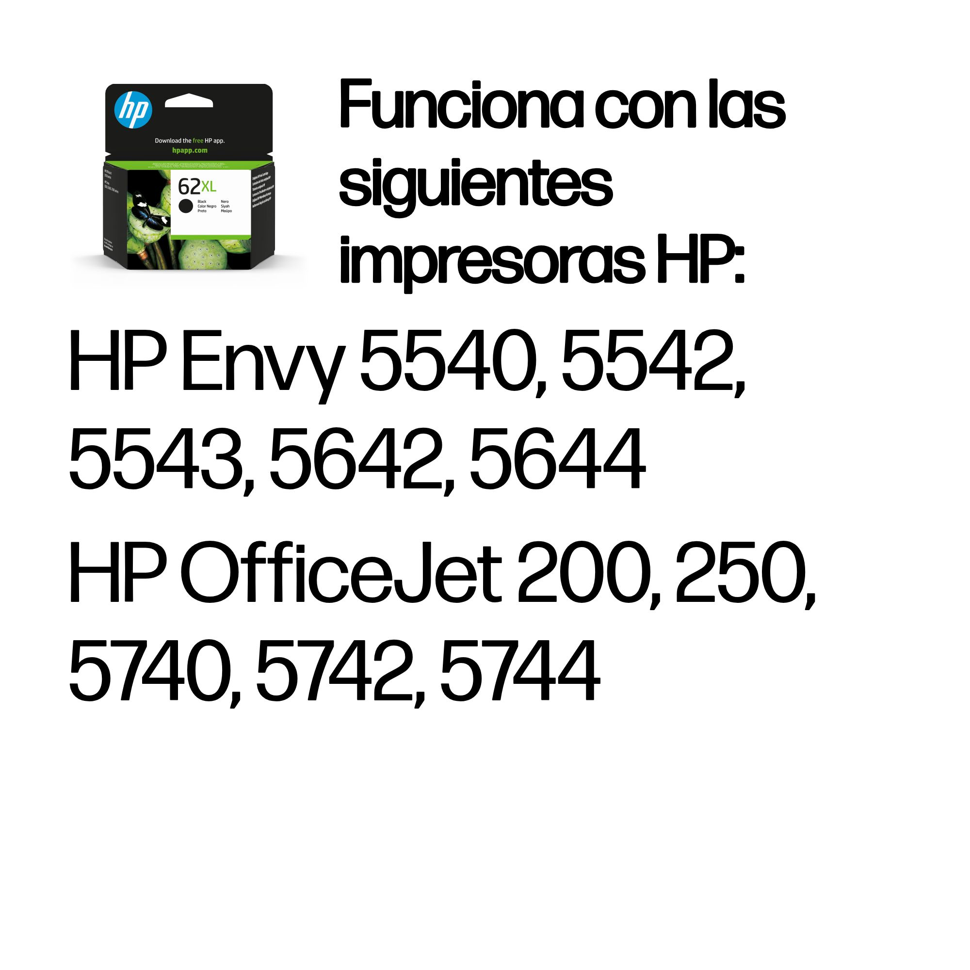 | Compatibilidad | Los cartuchos de Tinta HP 62 funcionan con: HP Envy 5540, 5542, 5543, 5642, 5644 HP OfficeJet 200, 250, 5740, 5742, 5744 |