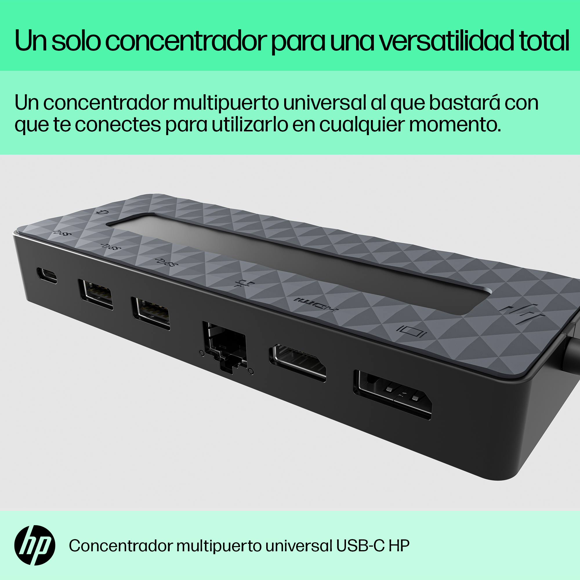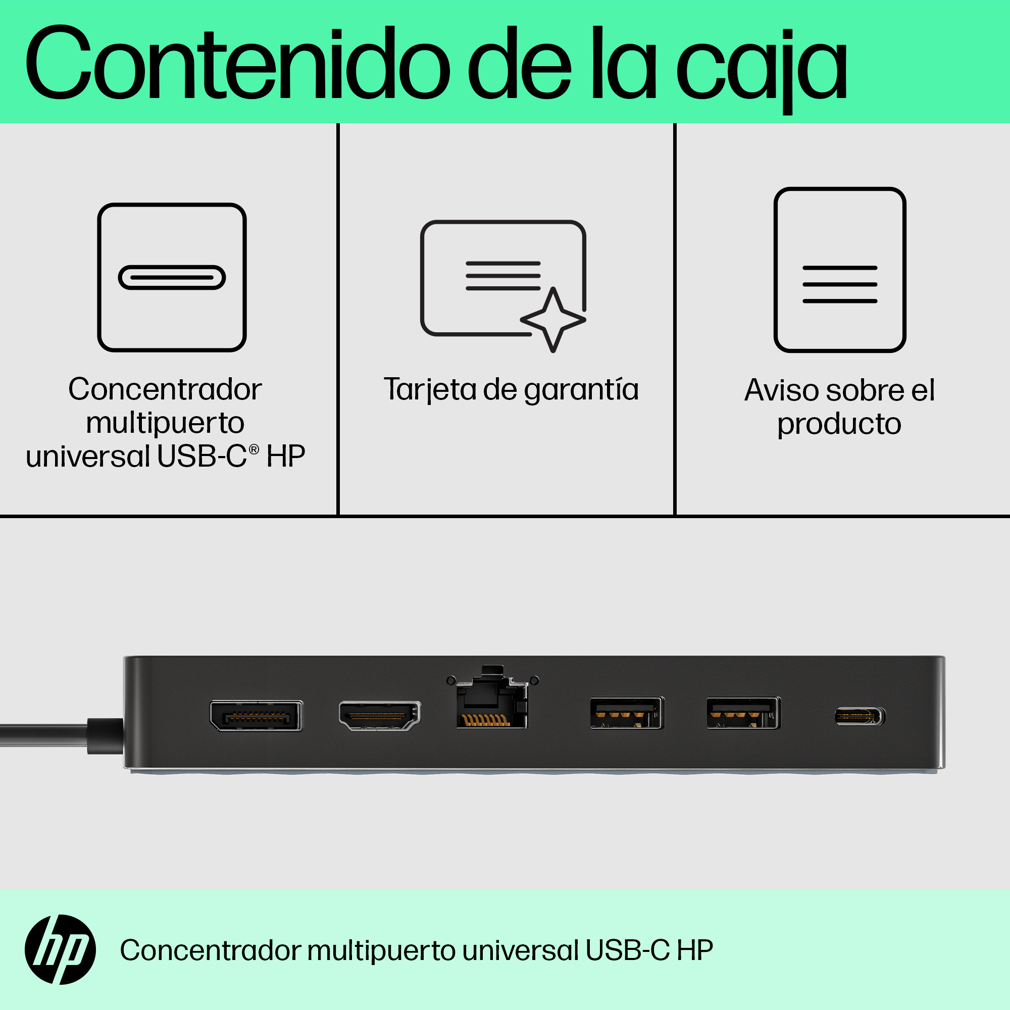 | Contenidos de caja | Concentrador multipuerto HP con USB-C universal; Aviso sobre el producto; Garantía |