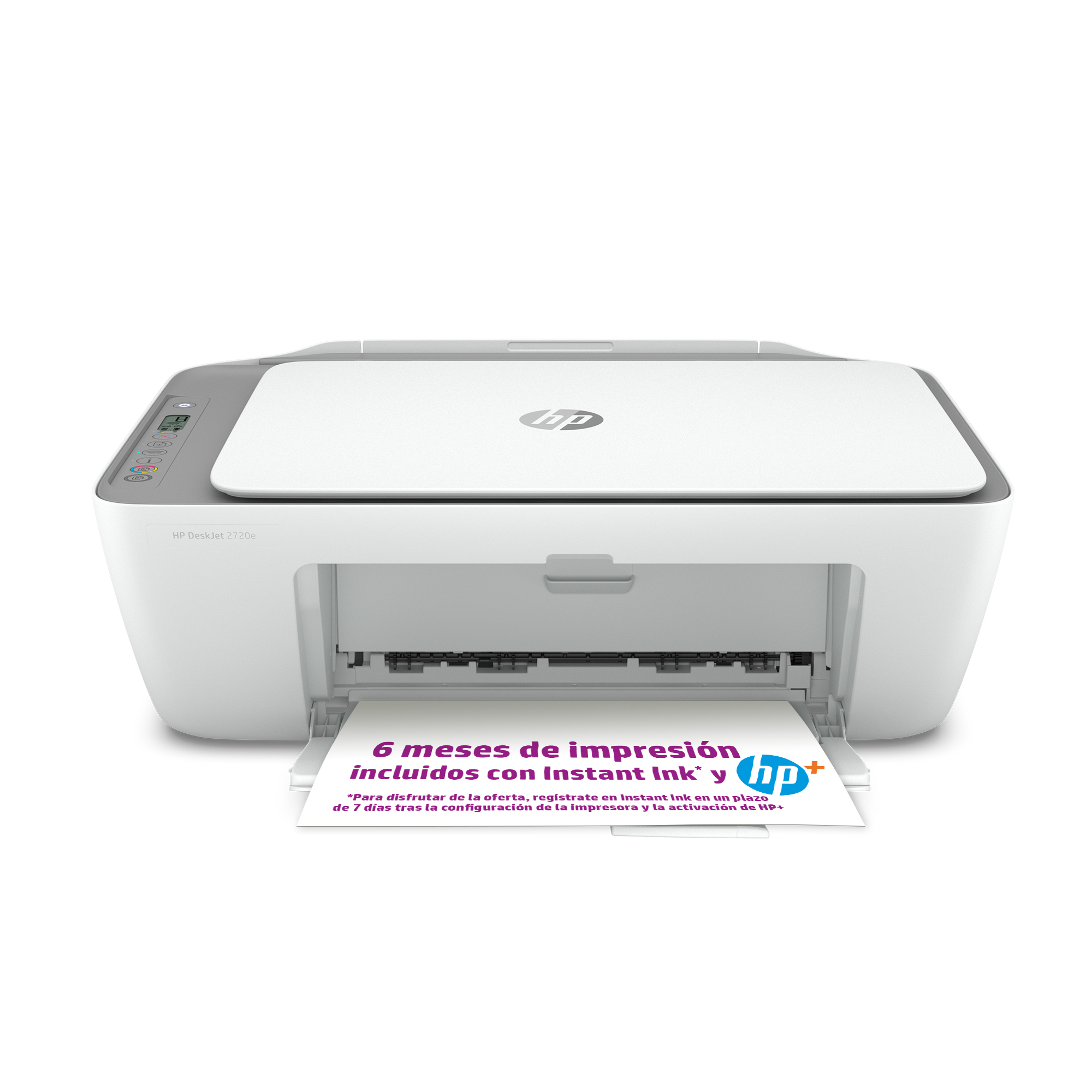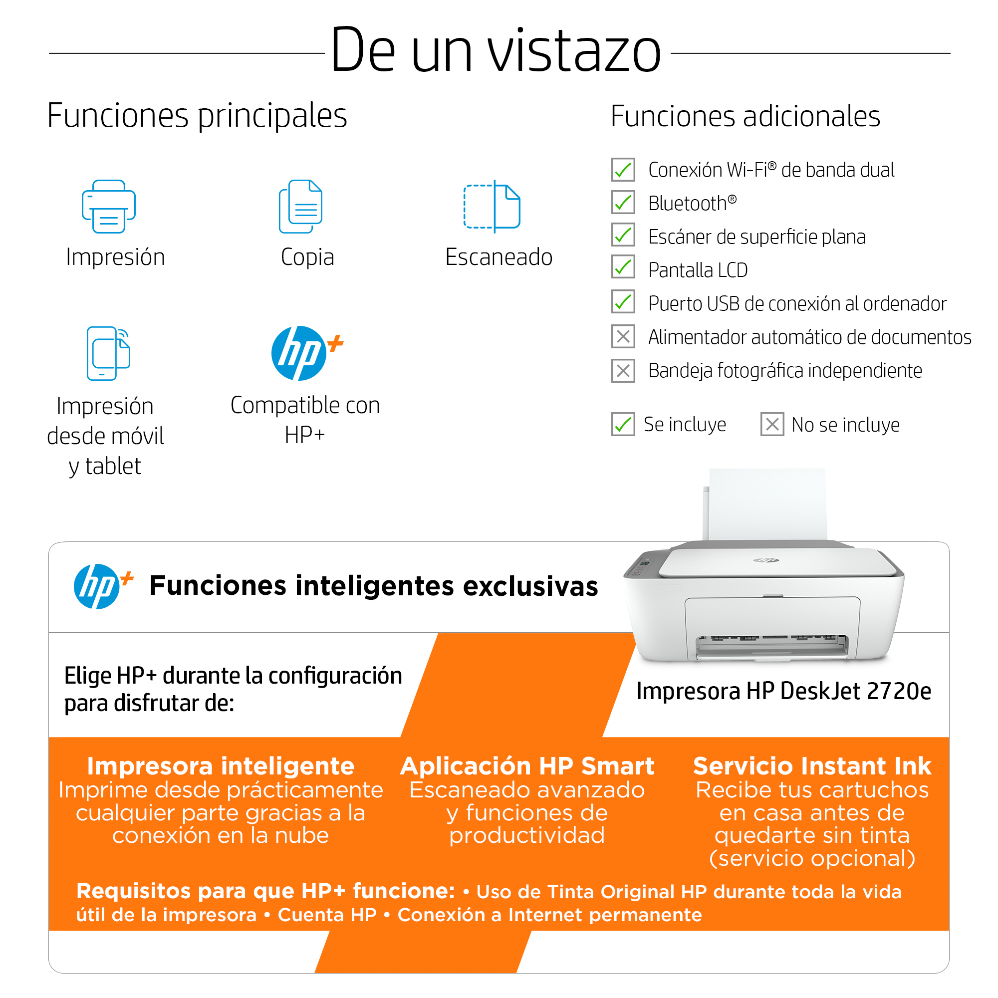 | Contenidos de caja | Impresora multifunción HP DeskJet 2720e; Cartucho de configuración HP 305 negro; Cartucho de configuración HP 305 tricolor; Folleto reglamentario; Guía de configuración; Guía de referencia; Cable de alimentación. Para obtener más información sobre el volumen de tinta y el rendimiento por página, visita http://www.hp.com/go/learnaboutsupplies. |