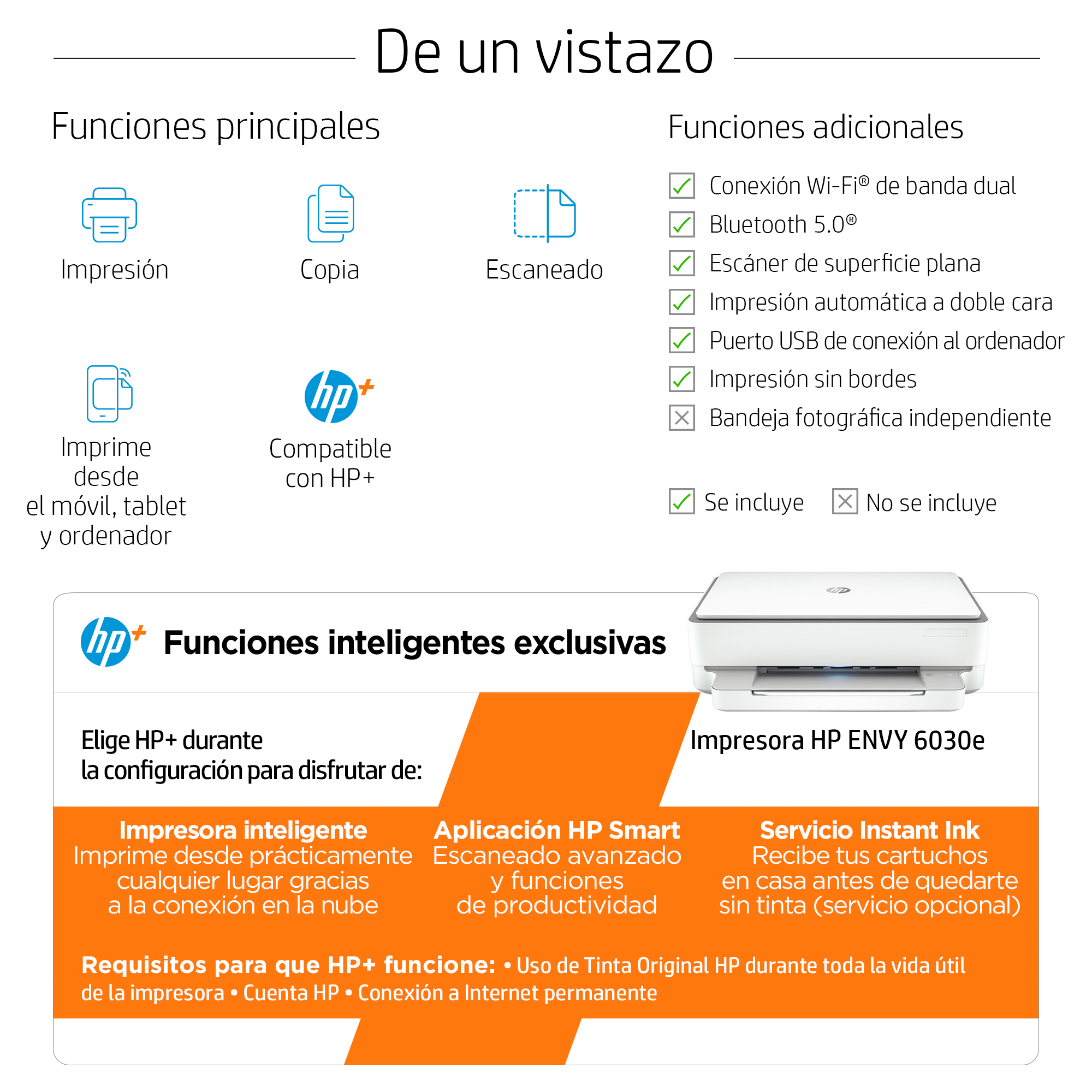 Esta es una impresora habilitada para HP+. Elige HP+ en la configuración del producto para activar las ventajas. HP+ requiere una cuenta HP, una conexión permanente a Internet y el uso exclusivo de cartuchos de Tinta Originales HP durante la vida útil de la impresora. Más información: http://www.hp.com/plus