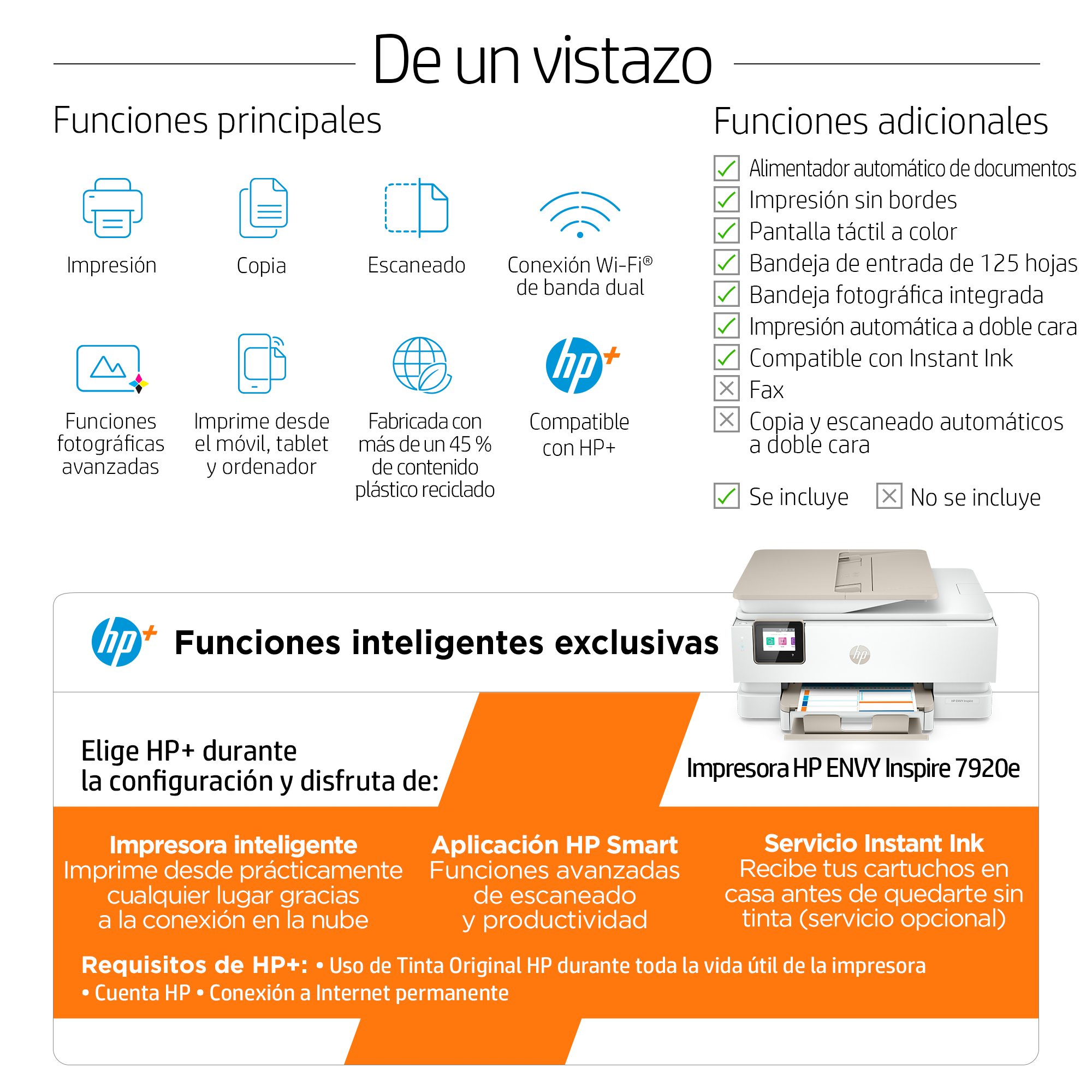 Esta es una impresora habilitada para HP+. Elige HP+ en la configuración del producto para activar las ventajas. HP+ requiere una cuenta HP, una conexión permanente a Internet y el uso exclusivo de cartuchos de Tinta Originales HP durante la vida útil de la impresora. Más información: http://www.hp.com/plus