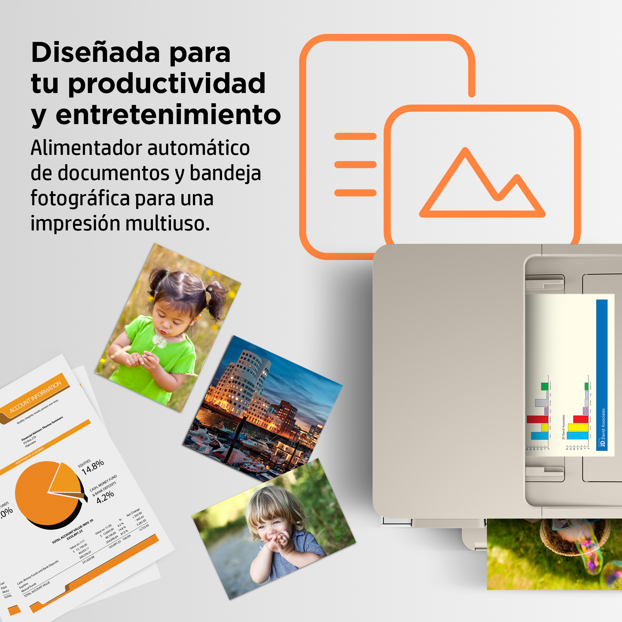 Impresión fluida de documentos y fotografías de alta calidad con una bandeja fotográfica integrada y un alimentador automático de documentos.