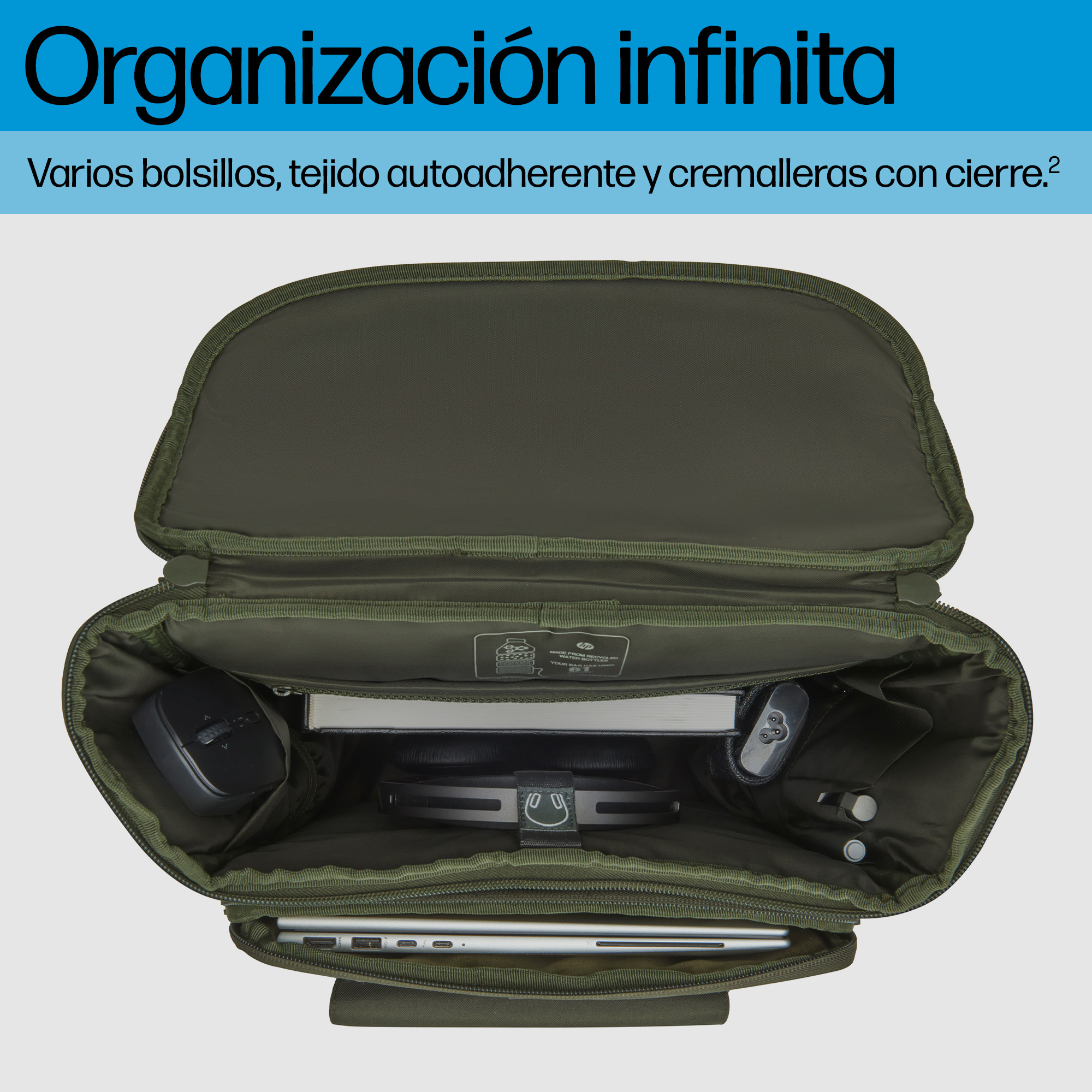 Aproveche el día a día con una mochila para portátiles que le facilita la organización mientras se desplaza. La capacidad total de 27 litros incluye una amplia gama de bolsillos internos y externos en la mochila, la funda y la bolsa. El tejido autoadherente sujeta sus pertenencias y las cremalleras con candado y los pasos para cables las mantienen seguras<sup>[2]</sup>.