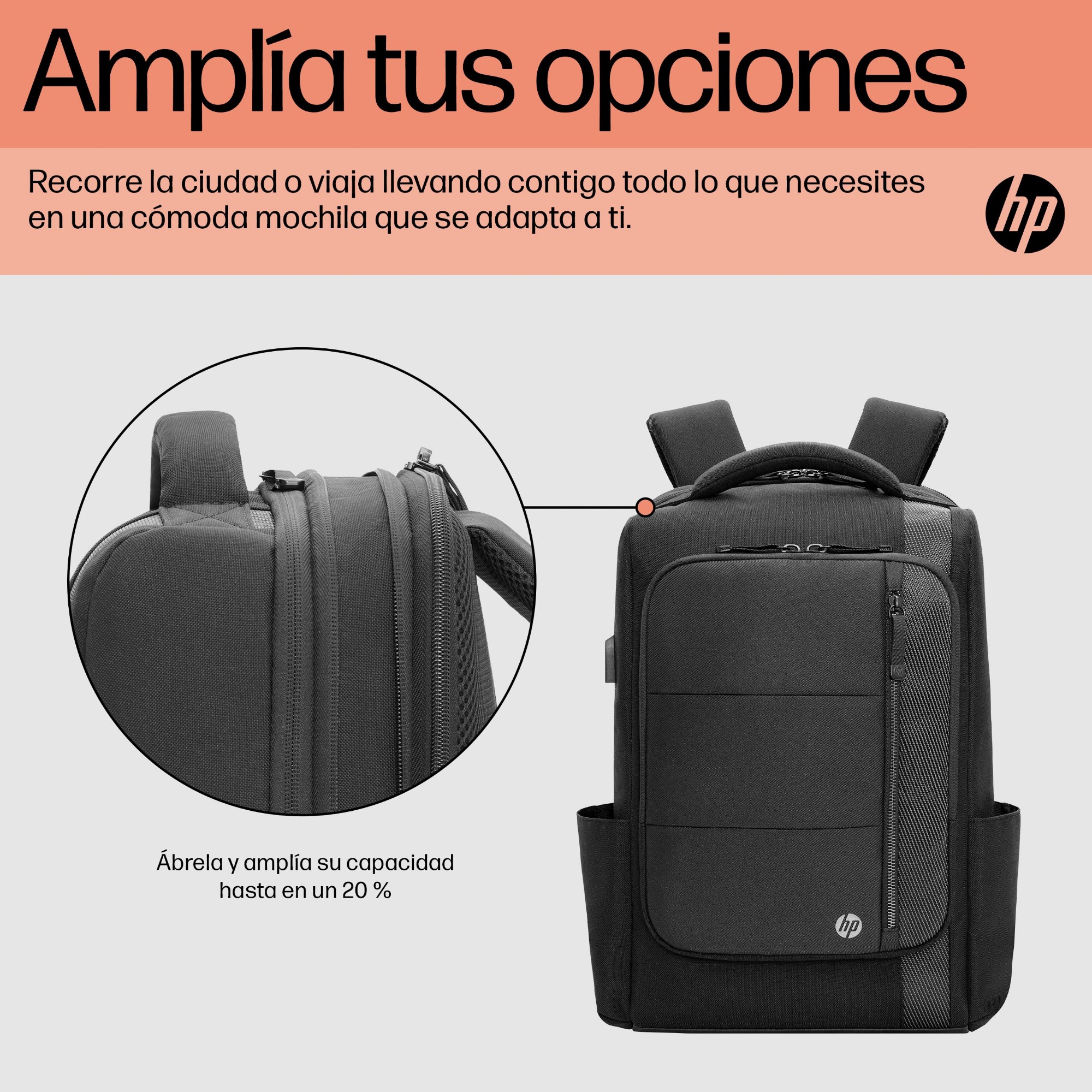 ¿No paras de moverte? Lleva todo lo que necesitas cuando vas a trabajar a la oficina o si estás de viaje con una cómoda mochila que se adapta a tu ritmo de vida. ¿Necesitas más espacio? Abre la cremallera y amplía la capacidad de la bolsa en un 20 %. Con tanto espacio, estás preparado para lo que el trabajo o la vida te depare.