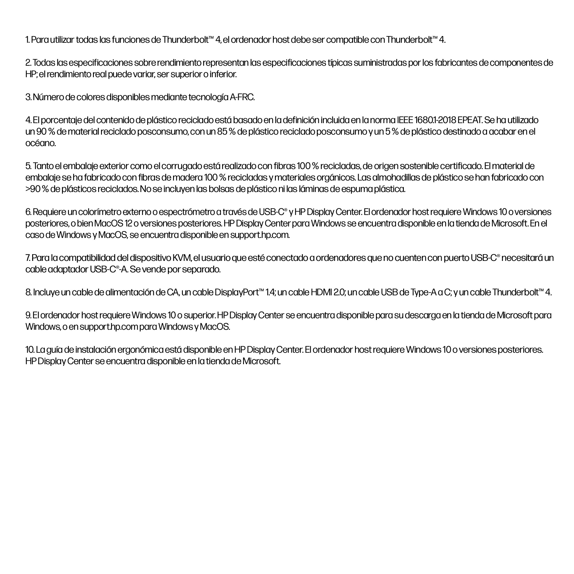 Certificación | BIS; BSMI; CB; CCC; CE; CECP; CEL; EAC; FCC; ISO 9241-307; KC; KCC; NOM; PSB; RCM; SEPA; TUV-S; UL/CSA; VCCI; WEEE; ISC; Luz azul de baja intensidad; Aplicación internacional; ICE; Emiratos Árabes Unidos; GS; Estados de Ucrania; Estados de Bielorrusia; MEPS de Corea; CEL de nivel 2 |
