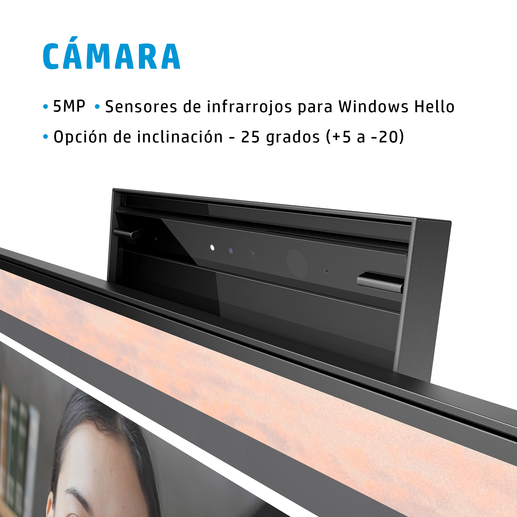 Cause una gran impresión en las videollamadas gracias a este monitor full HD para videoconferencias de 60,45 cm (23,8 pulgadas). La cámara web emergente integrada de 5 MP con inclinación ajustable muestra una imagen nítida y detallada (incluso en condiciones de poca luz) y los altavoces y micrófono integrados producen un sonido claro y realista. Todo lo que necesita para presentarse del mejor modo posible en cada llamada. [1]