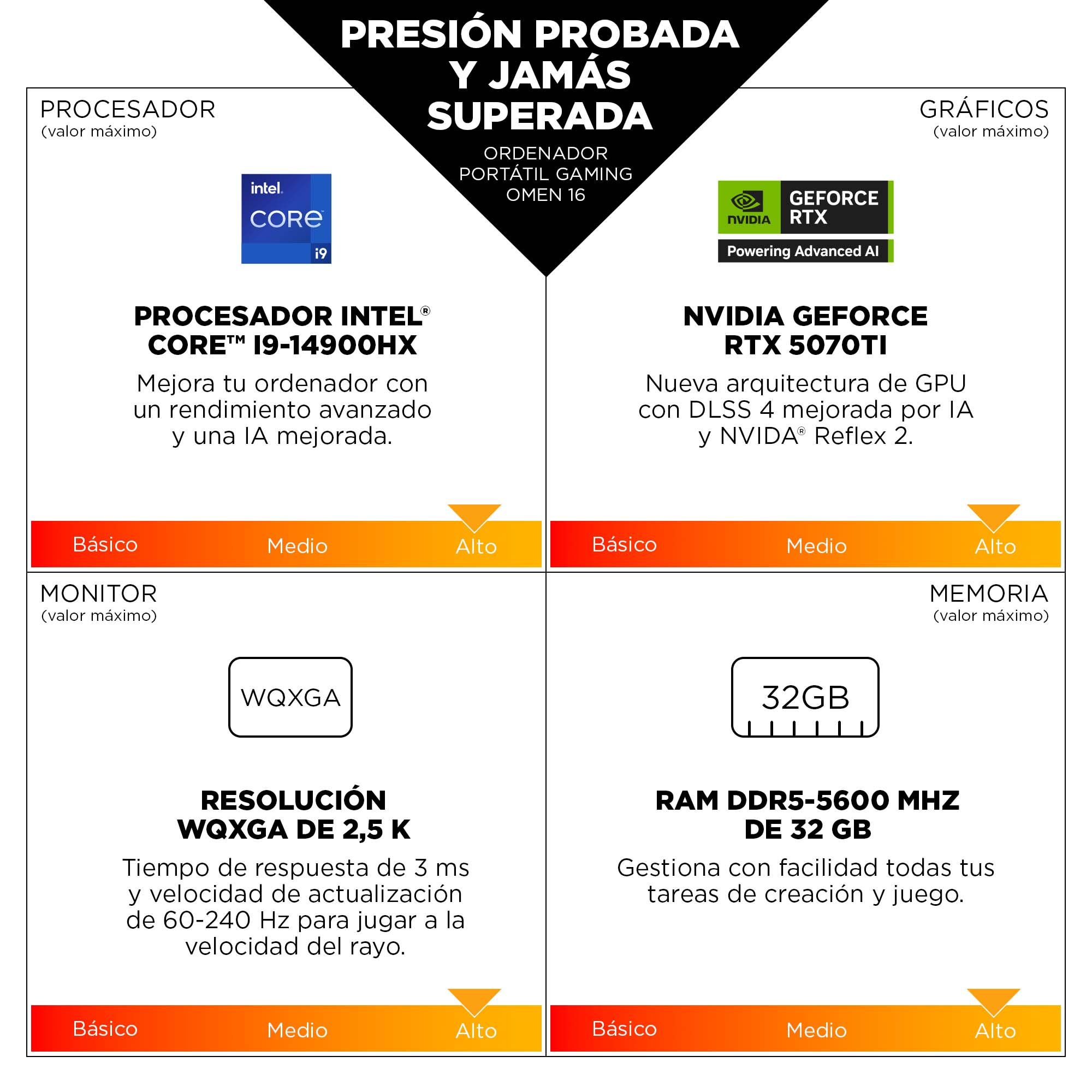 El nuevo OMEN 16 no solo cuenta con la potencia de los componentes más recientes de nueva generación de Intel[1] y NVIDIA, sino que cuenta con las innovaciones térmicas adecuadas para evitar que se quemen. Combínalo con la IA de OMEN para obtener el máximo de FPS posible con solo hacer clic en un botón y el modo Desatado para conseguir un impulso adicional en el rendimiento, y tendrás nuestro portátil más fiable y potente hasta la fecha.