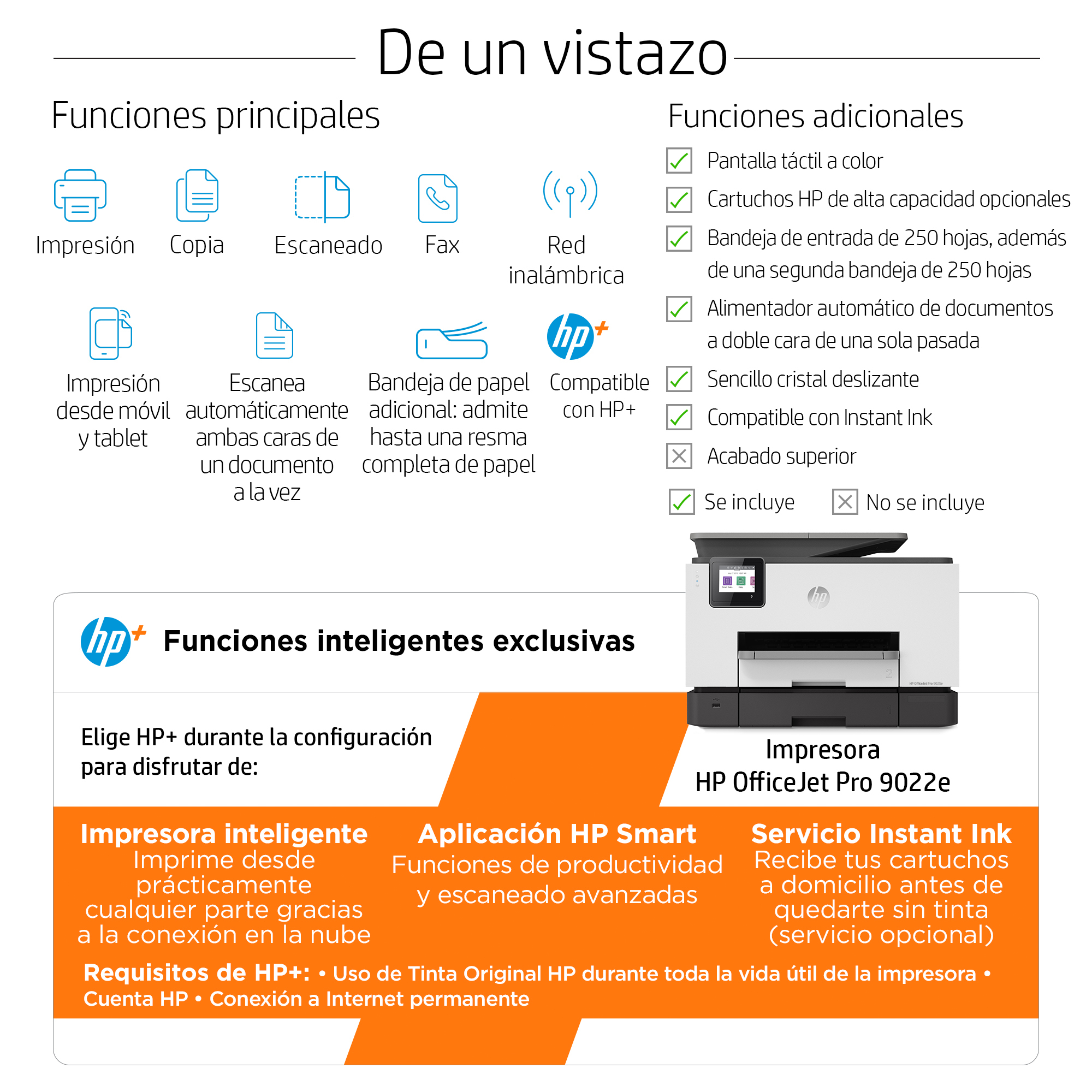 | Contenidos de caja | Impresora multifunción HP OfficeJet Pro 9022e; Cartucho de tinta de configuración HP 963 negro; Cartucho de tinta de configuración HP 963 cian; Cartucho de tinta de configuración HP 963 magenta; Cartucho de tinta de configuración P 963 amarillo; Folleto reglamentario; Folleto con advertencias relativas a la tinta; Cable de alimentación; Póster de configuración; Guía de referencia. Para obtener más información acerca del llenado y rendimiento, consulta http://www.hp.com/go/learnaboutsupplies. |
