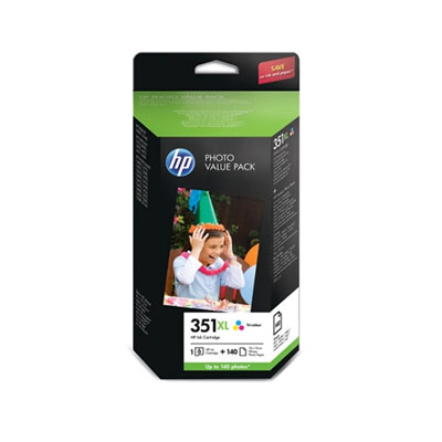 El cartucho de inyección de tinta tricolor HP 351XL con tintas Vivera combinado con papel fotográfico satinado HP Premium en un solo producto asequible le permite obtener fotos en color de calidad profesional asequibles desde casa con comodidad.