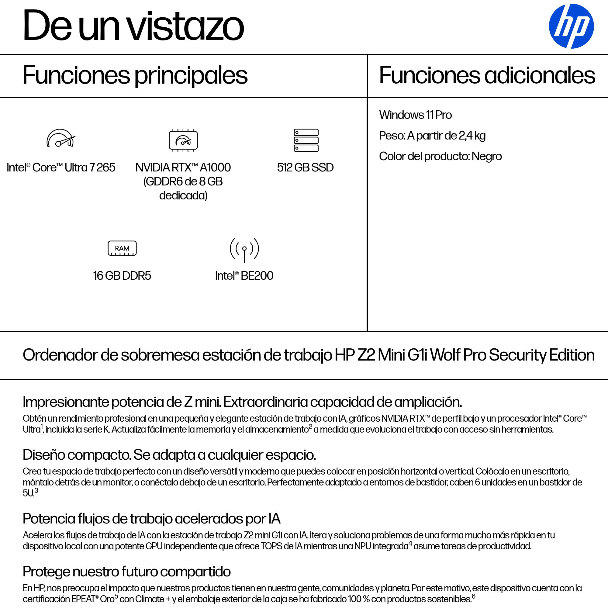 HP Z2 G1i Wolf Pro Security Edition Intel Core Ultra 7 265 16 GB DDR5-SDRAM 512 GB SSD NVIDIA RTX A1000 Windows 11 Pro Mini PC Puesto de trabajo AI Workstation, AI PC Negro