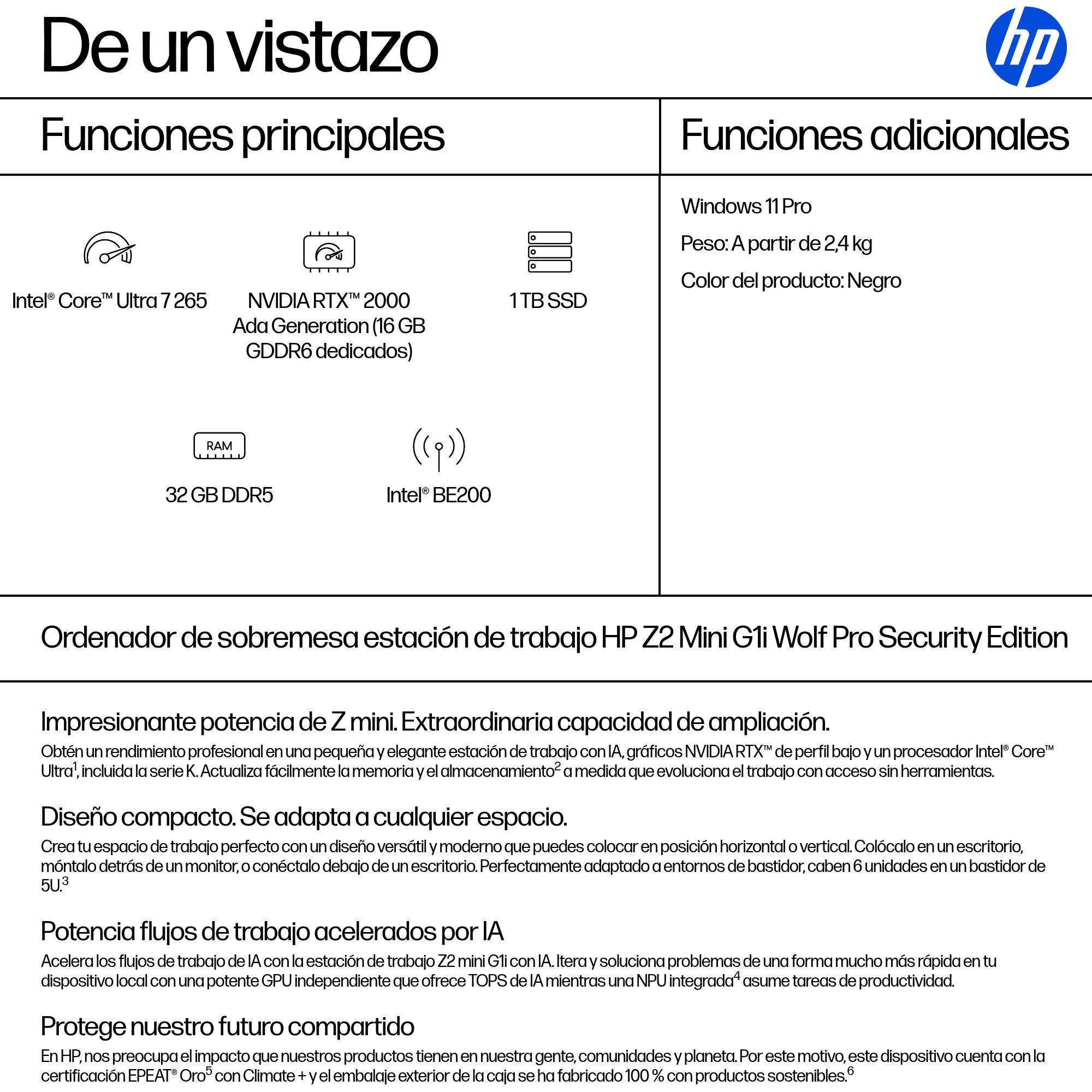 HP Z2 G1i Wolf Pro Security Edition Intel Core Ultra 7 265 32 GB DDR5-SDRAM 1 TB SSD NVIDIA RTX 2000 Ada Windows 11 Pro Mini PC Puesto de trabajo AI Workstation, AI PC Negro