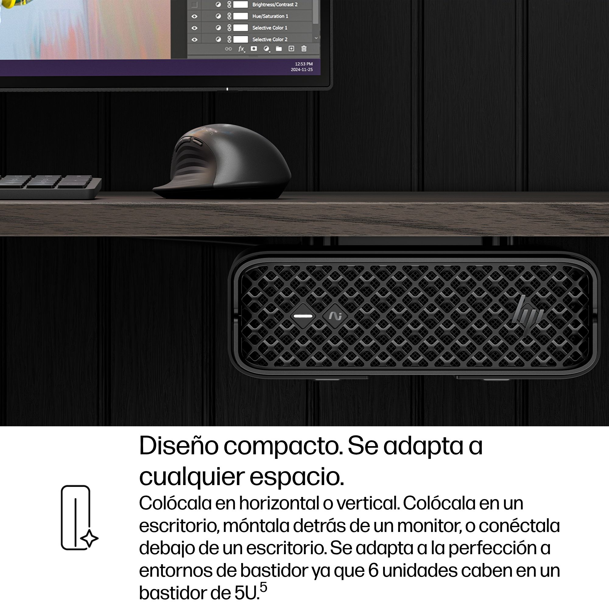 Crea tu espacio de trabajo perfecto con un diseño versátil y moderno que puedes colocar en posición horizontal o vertical. Colócalo en un escritorio, móntalo detrás de un monitor, o conéctalo debajo de un escritorio. Perfectamente adaptado a entornos de bastidor, caben 6 unidades en un bastidor de 5U.[3]