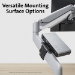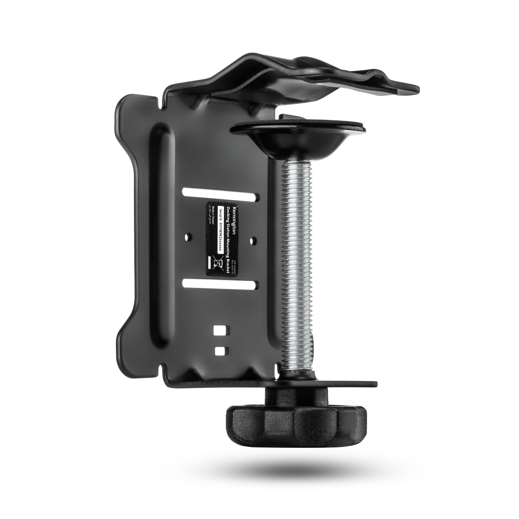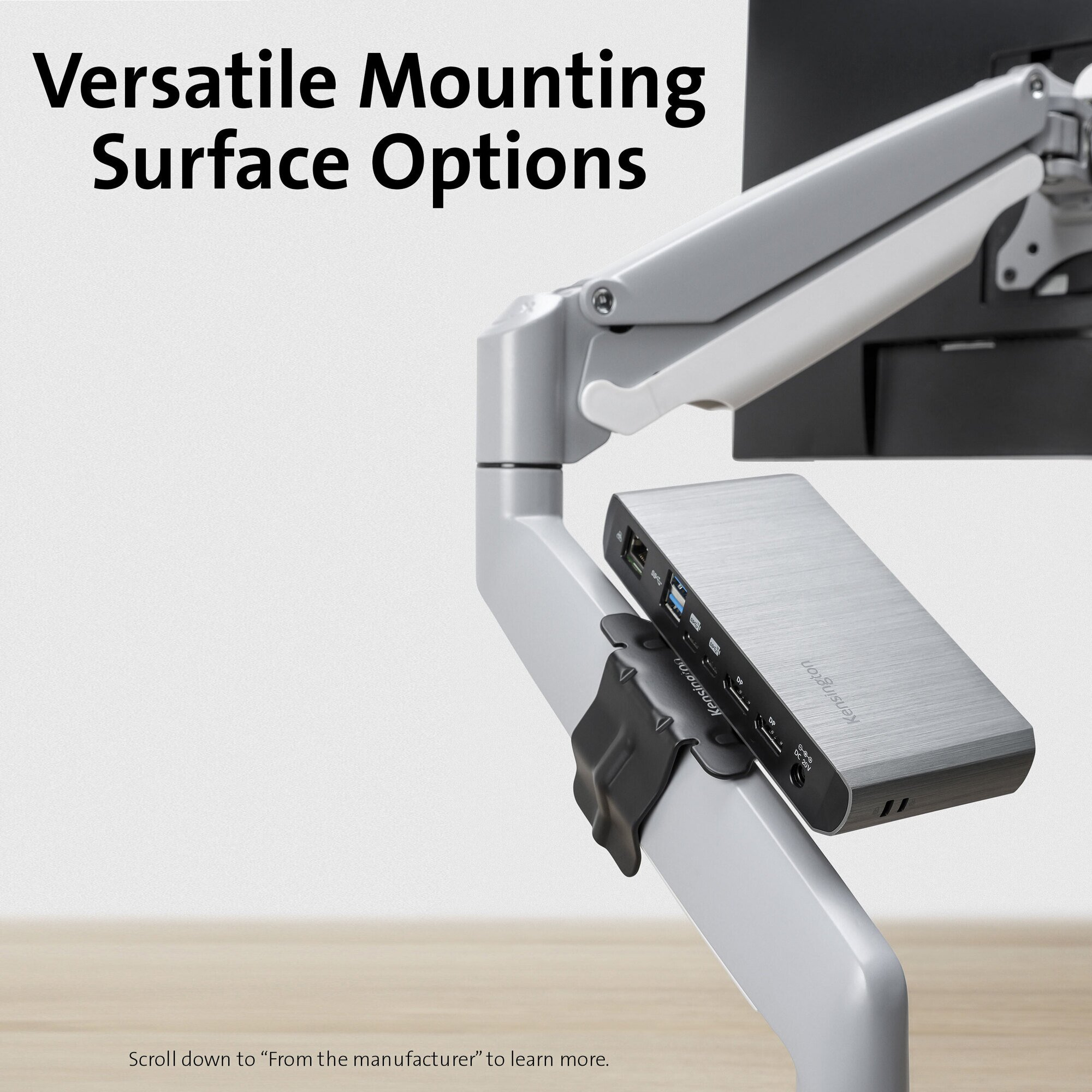 La abrazadera ajustable se fija fácilmente a la pared divisoria de un cubículo, a un soporte o al brazo del monitor, al borde de un escritorio o a otra superficie para lograr la máxima flexibilidad de montaje.