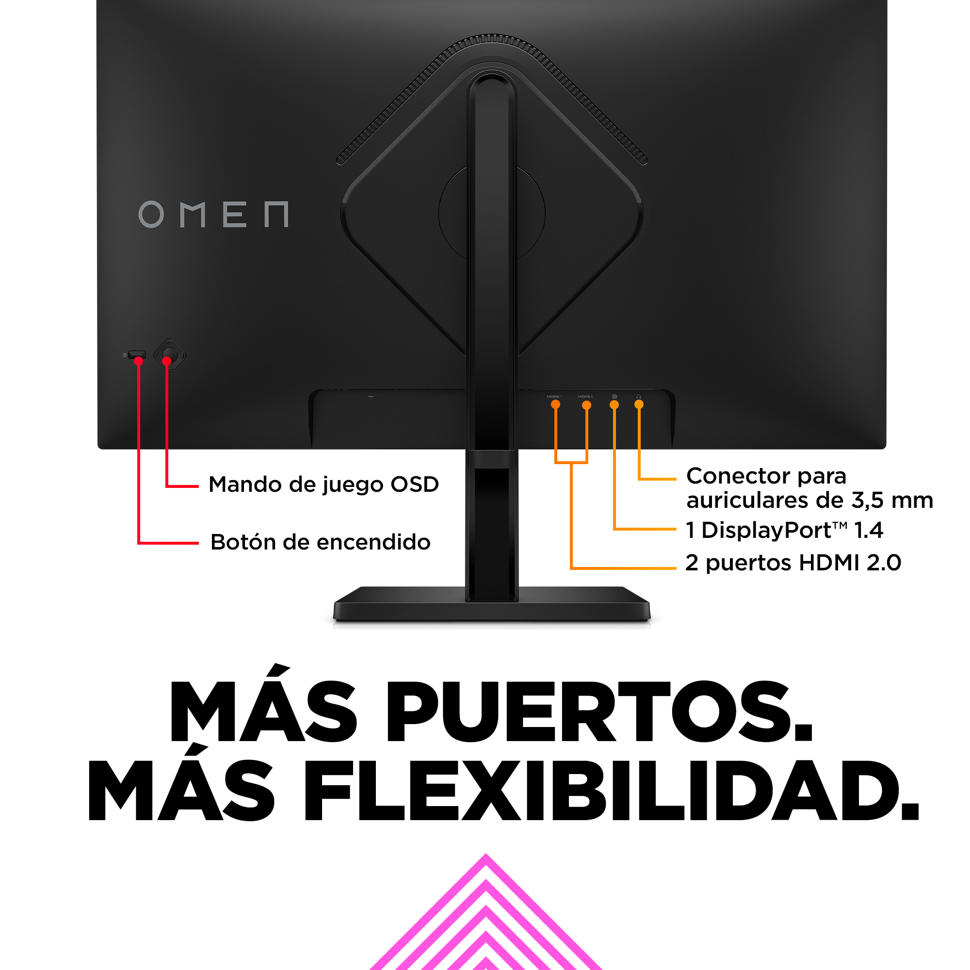 Diseñado para impresionar tanto dentro como fuera del juego, el nuevo look del OMEN combina sofisticación y diversión para elevar la presencia de este equipo gaming. Está equipado con puertos que son perfectos para conectar su ordenador, videoconsola e incluso el ordenador de trabajo. Gracias a una gestión sencilla del cableado y al soporte ajustable, su escritorio lucirá como a usted le gusta.