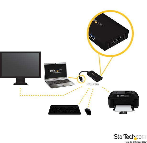 El adaptador USB32HDEH3 también incluye un concentrador USB 3.0 de 3 puertos, que permite utilizarlo como base de conexión de periféricos como ratones, impresoras y teclados, junto con el monitor. Es muy sencillo de utilizar, basta con conectar el ordenador portátil al adaptador, a fin de sincronizar cada dispositivo conectado a la estación de trabajo: una solución versátil para aumentar la portabilidad y potencia del PC portátil cuando sea necesario.