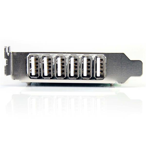 La Tarjeta Adaptadora PCIe de 7 Puertos USB 2.0 de Perfil Bajo, PEXUSB7LP constituye una manera eficaz y económica de incorporar siete puertos USB 2.0 a un ordenador de factor de forma pequeño y obtener rendimiento y versatilidad mejoradas.La tarjeta agrega 6 ranuras USB 2.0 externas y 1 puerto interno USB 2.0 y admite tasas de transferencia de datos USB 2.0 de alta velocidad de hasta 480 Mbps. Esta versátil tarjeta PCIe USB incluye controladores WHQL certificados y soporte plug and play lo que se traduce en un ahorro de tiempo y esfuerzo.Es capaz de adaptarse a prácticamente cualquier gabinete de ordenador ya que esta tarjeta USB de perfil bajo dispone de un soporte de perfil estándar para la instalación en gabinetes de forma completa