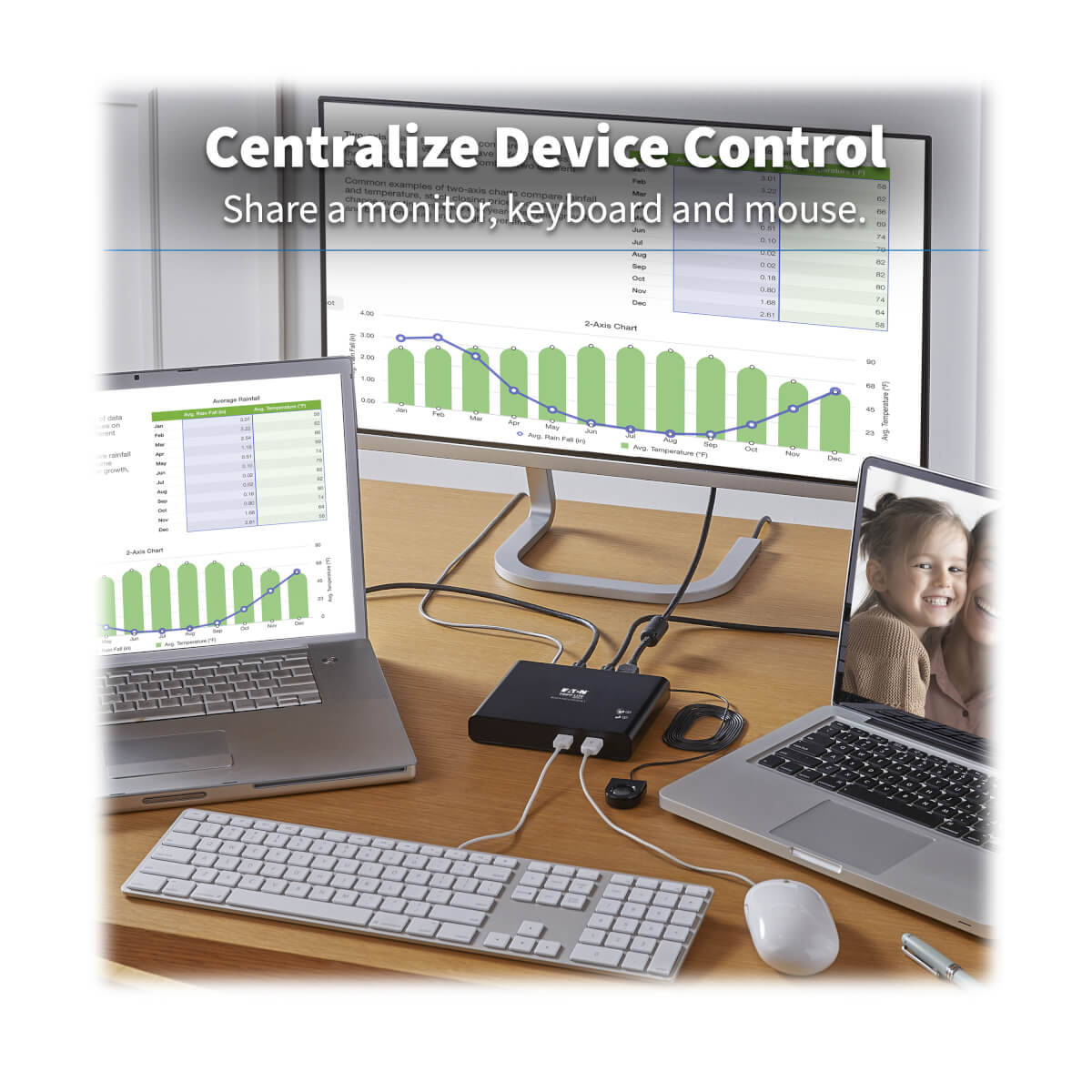 El hub USB 3.1 Gen1 de dos puertos incorporado le permite compartir periféricos USB, como impresoras, discos duros, escáneres, cámaras web y memorias USB, entre ambas computadoras y fuentes conectadas. El hub es compatible con versiones anteriores de los dispositivos USB 2.0 y 1.1.