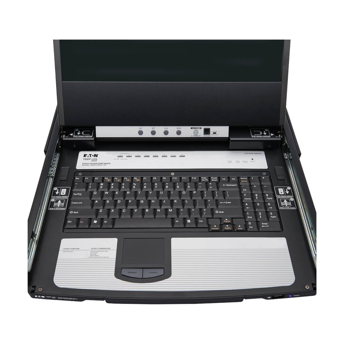 El B030-DP08-17D de doble riel soporta resoluciones de video de alta definición de hasta 1920 x 1080 (1080p) @ 60 Hz. La amplia pantalla se abre para proporcionar acceso a las computadoras conectadas, haciendo más fácil y conveniente la realización de multitareas y se pliega para evitar que la consola bloquee el equipo de rack adyacente cuando no esté en uso. El LCD y el teclado/panel táctil están en rieles separados, de modo que el LCD puede permanecer abierto mientras el teclado y panel táctil se guardan fuera del paso, manteniendo despejado el pasillo del rack.