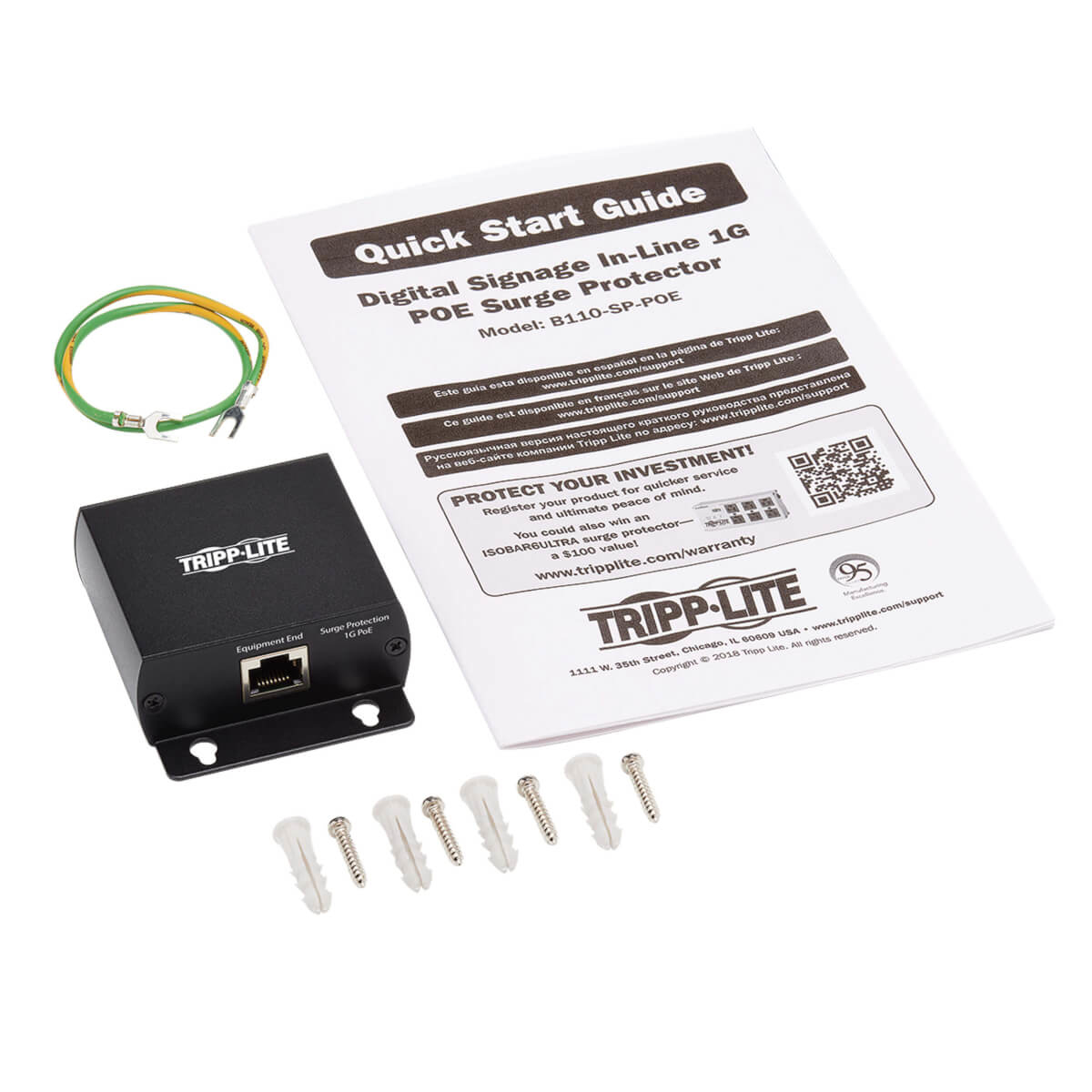 Este supresor de sobretensiones en línea PoE cumple los estándares IEEE 802.3af y 802.3at, a la vez que admite velocidades de transmisión de datos de hasta 1 Gbps. No requiere de software, controladores o fuente de alimentación externa La compacta caja metálica está diseñada para resistir en aplicaciones donde es probable que se produzca una descarga estática. Se incluyen accesorios de instalación para una instalación conveniente cuando sea necesario. Asegúrese de que la distancia entre el B110-SP-POE y el equipo que protege no sea más de 91.4 m [300 pies].