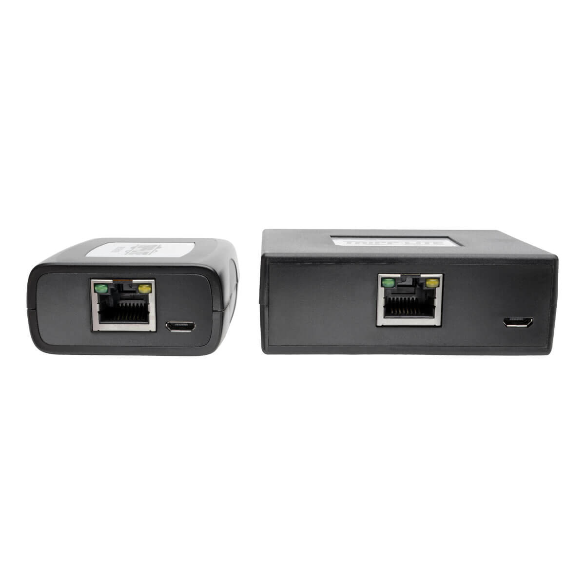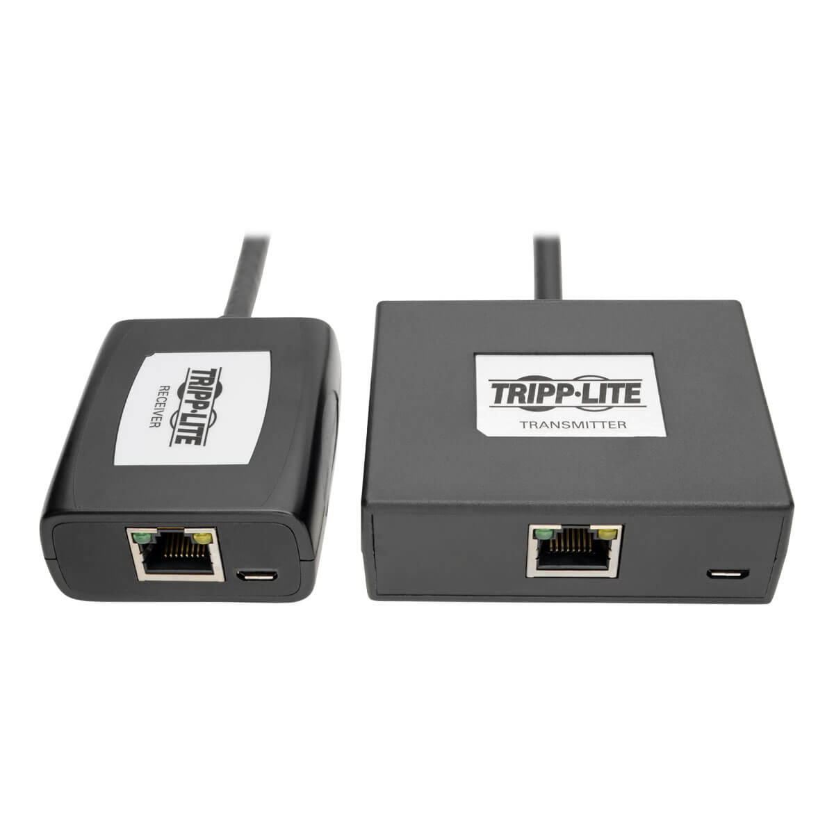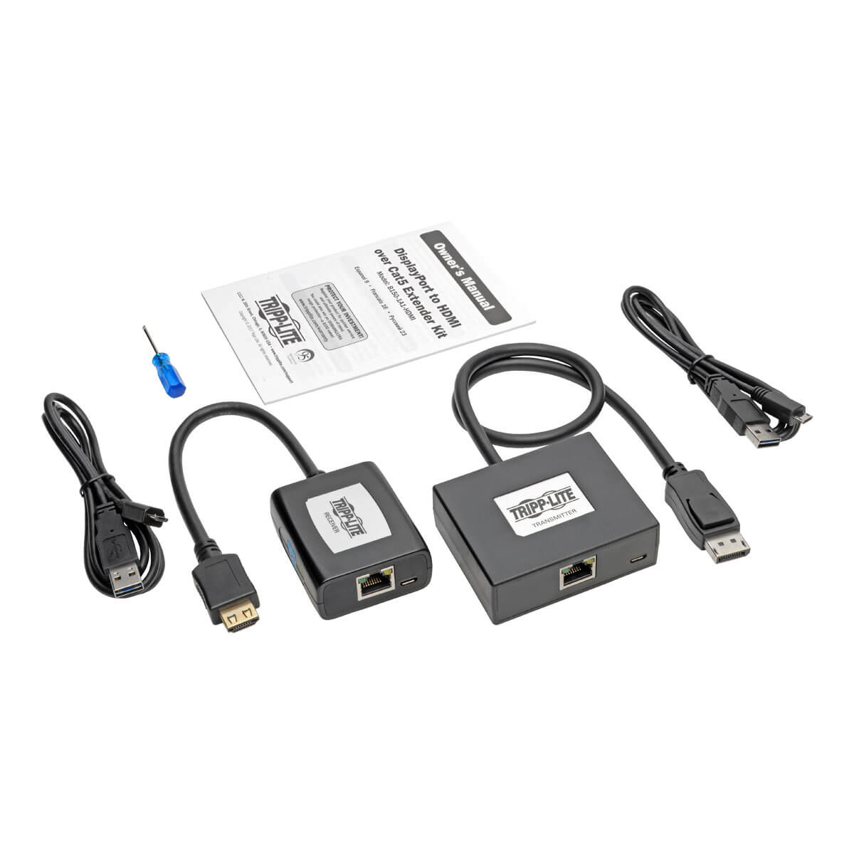 El transmisor y el receptor se conectan con un cable Cat5e / Cat6 (para mejores resultados, use cable Cat5e / Cat6 de alambre sólido 24 AWG, como la serie N202 de Tripp Lite) Un cable DisplayPort incorporado conecta el transmisor a la fuente, mientras un cable HDMI conecta el receptor a la pantalla. El cable HDMI incorporado cuenta con un conector de seguridad que ayuda a evitar una desconexión accidental. Los cables USB Micro-B incluidos conectan el transmisor a un puerto USB en la computadora DisplayPort o un cargador USB de pared (como el U280-002-W12 de Tripp Lite) y conectan el receptor a un puerto USB en la pantalla HDMI o un cargador USB de pared. No se necesita fuente de alimentación externa.