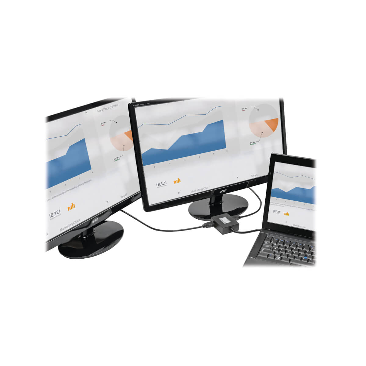 El Divisor DisplayPort a HDMI de 2 Puertos B157-002-HD convierte y divide una señal de video DisplayPort para desplegarse simultáneamente en dos monitores, proyectores o televisores equipados con HDMI. Ideal para oficinas, salas de conferencias, establecimientos de menudeo, exposiciones comerciales y salones de clases, este compacto divisor cuenta con un cable DisplayPort incorporado que se conecta a la fuente. Le permite usar sus pantallas HDMI existentes en vez de comprar nuevos monitores o estaciones de conexión DisplayPort.