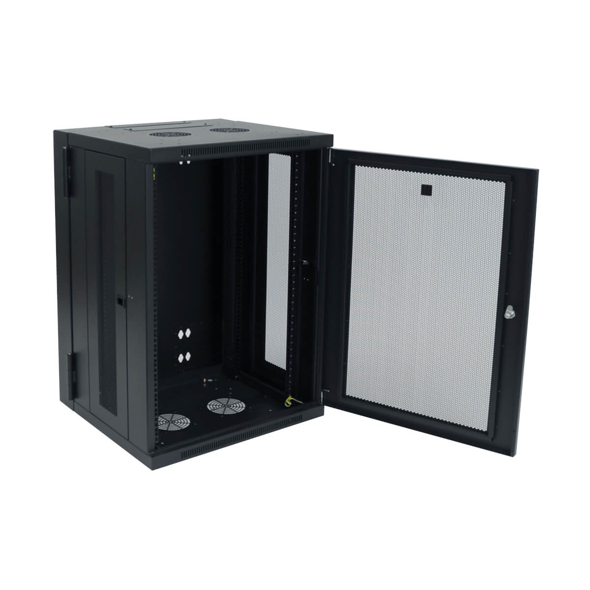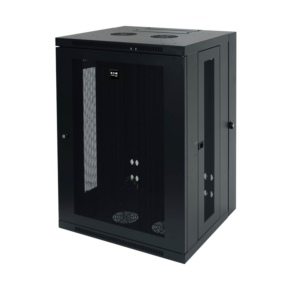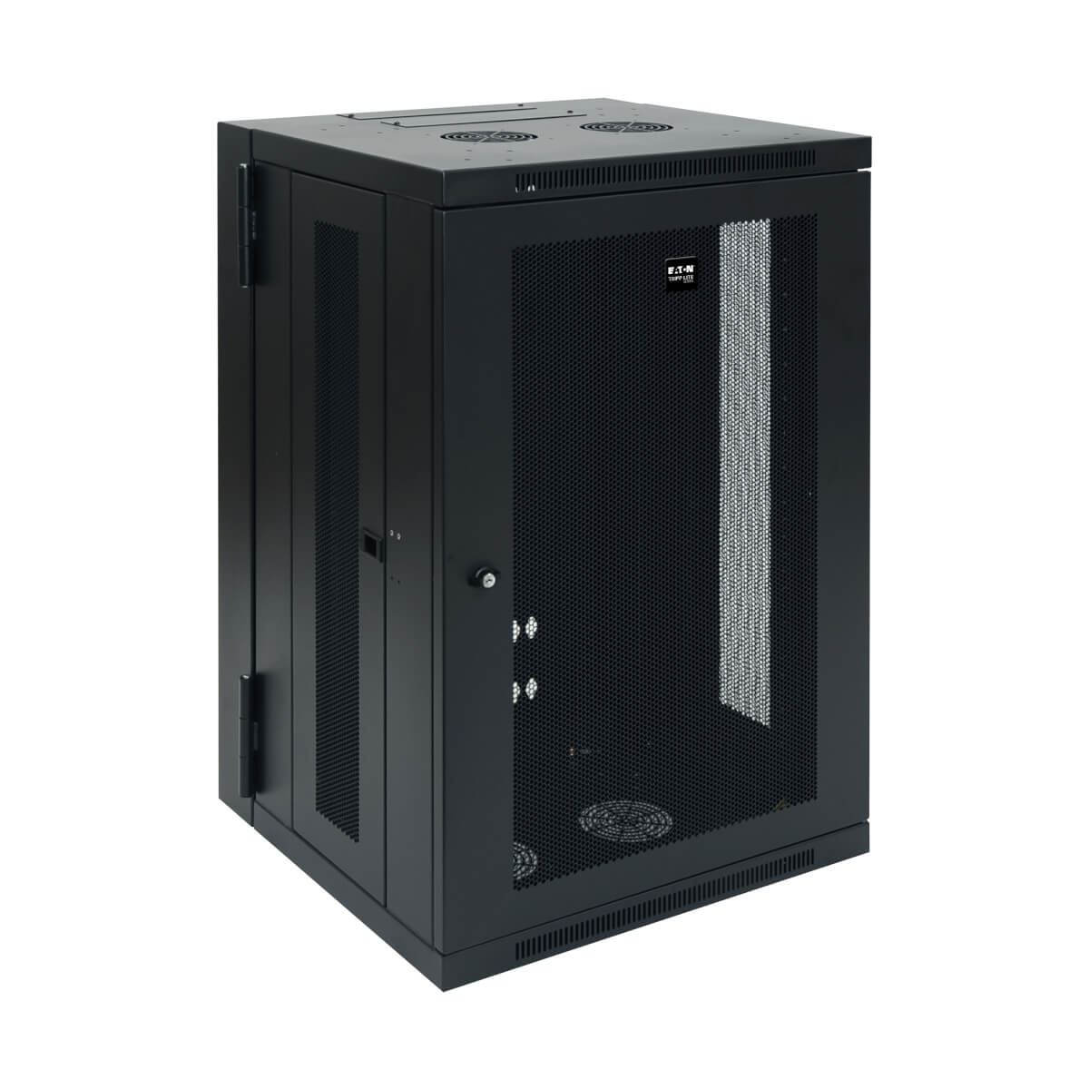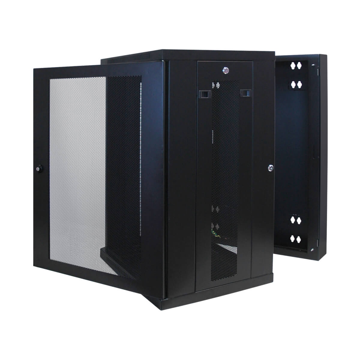 El gabinete se puede girar a una distancia adecuada de la pared, sujetado por una bisagra resistente, lo que permite un fácil acceso al equipo y al cableado por la puerta trasera durante la instalación y el mantenimiento. Las puertas y los paneles laterales se cierran con cerradura para evitar daños, manipulación indebida o robos. Los paneles del frente, arriba, abajo y laterales extraíbles tienen ventilación, lo que permite que fluya aire libremente para mantener al equipo fresco. Las puertas reversibles pueden abrirse hacia la izquierda o la derecha haciendo girar el gabinete 180° antes de instalarlo. Convenientes puertos ubicados en la parte superior e inferior permiten un fácil enrutamiento de los cables.