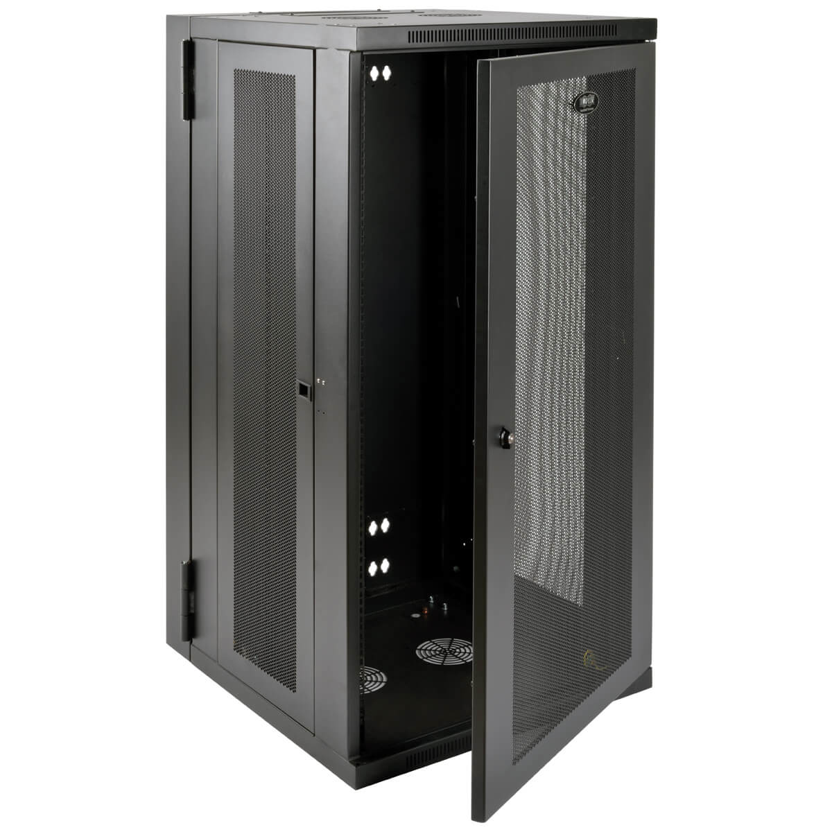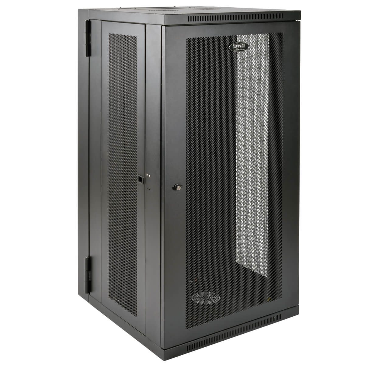 El gabinete se puede girar a una distancia adecuada de la pared, sujetado por una bisagra resistente, lo que permite un fácil acceso al equipo y al cableado por la puerta trasera durante la instalación y el mantenimiento. Las puertas y los paneles laterales se cierran con cerradura para evitar daños, manipulación indebida o robos. Los paneles del frente, arriba, abajo y laterales extraíbles tienen ventilación, lo que permite que fluya aire libremente para mantener al equipo fresco. Las puertas reversibles pueden abrirse hacia la izquierda o la derecha haciendo girar el gabinete 180° antes de instalarlo. Convenientes puertos ubicados en la parte superior e inferior permiten un fácil enrutamiento de los cables.