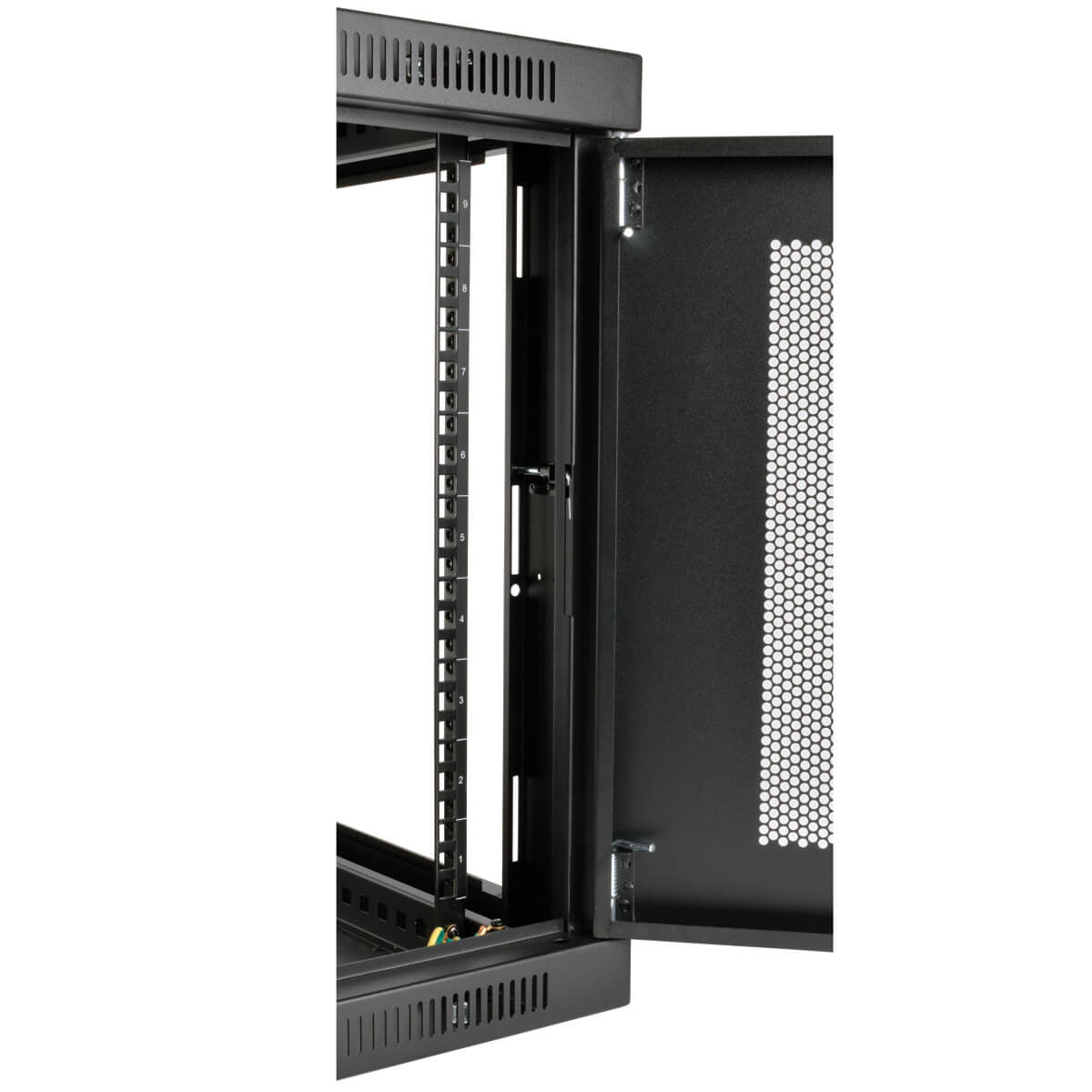 El SRW9UDP viene totalmente ensamblado y listo para su instalacion en la pared, o utilice el juego de ruedas opcional SRCASTER de Tripp Lite para convertirlo en un rack movil. Los orificios de instalacion cuadrados y roscados 12-24 y los espacios de rack numerados hacen que la instalacion del equipo sea sencilla. Los rieles de instalacion verticales se ajustan en incrementos de 7/8"" para alojar el equipo a una profundidad de hasta 52 cm [20.5""], como switches de red y paneles de conexiones.