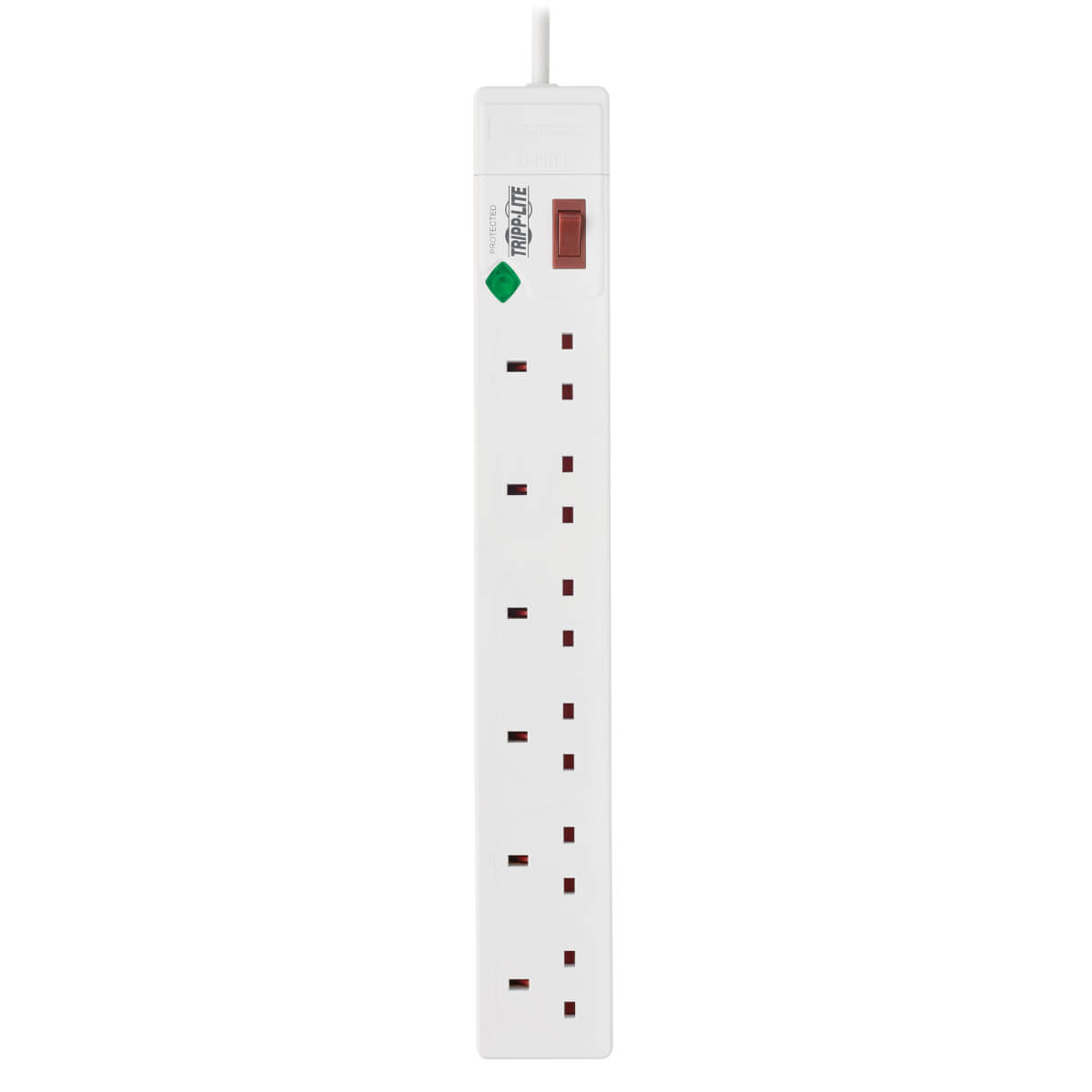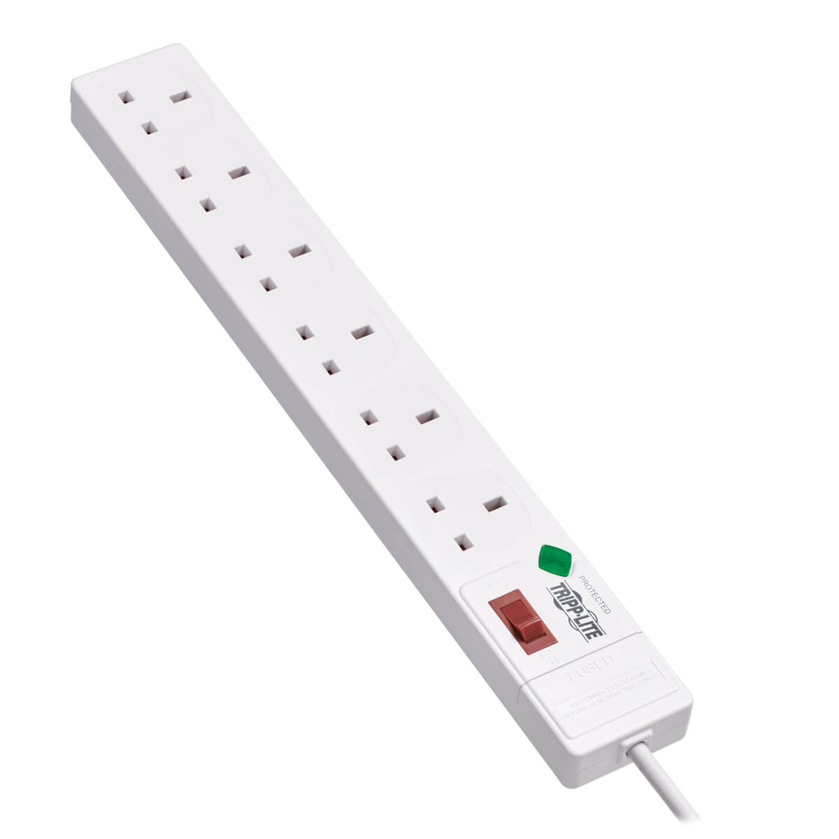 Tripp Lite TLP6B18. Índice de aumento de energía: 250 J, Cantidad de salidas AC: 6 salidas AC, Tipo de salida AC: Tipo G (BS 1363). Conector: Tipo G (BS 1363). Color del producto: Blanco, Material: Plástico, País de origen: China. Longitud de cable: 1,8 m, Peso: 500 g, Ancho: 78,7 mm. Certificación: CE, Reach