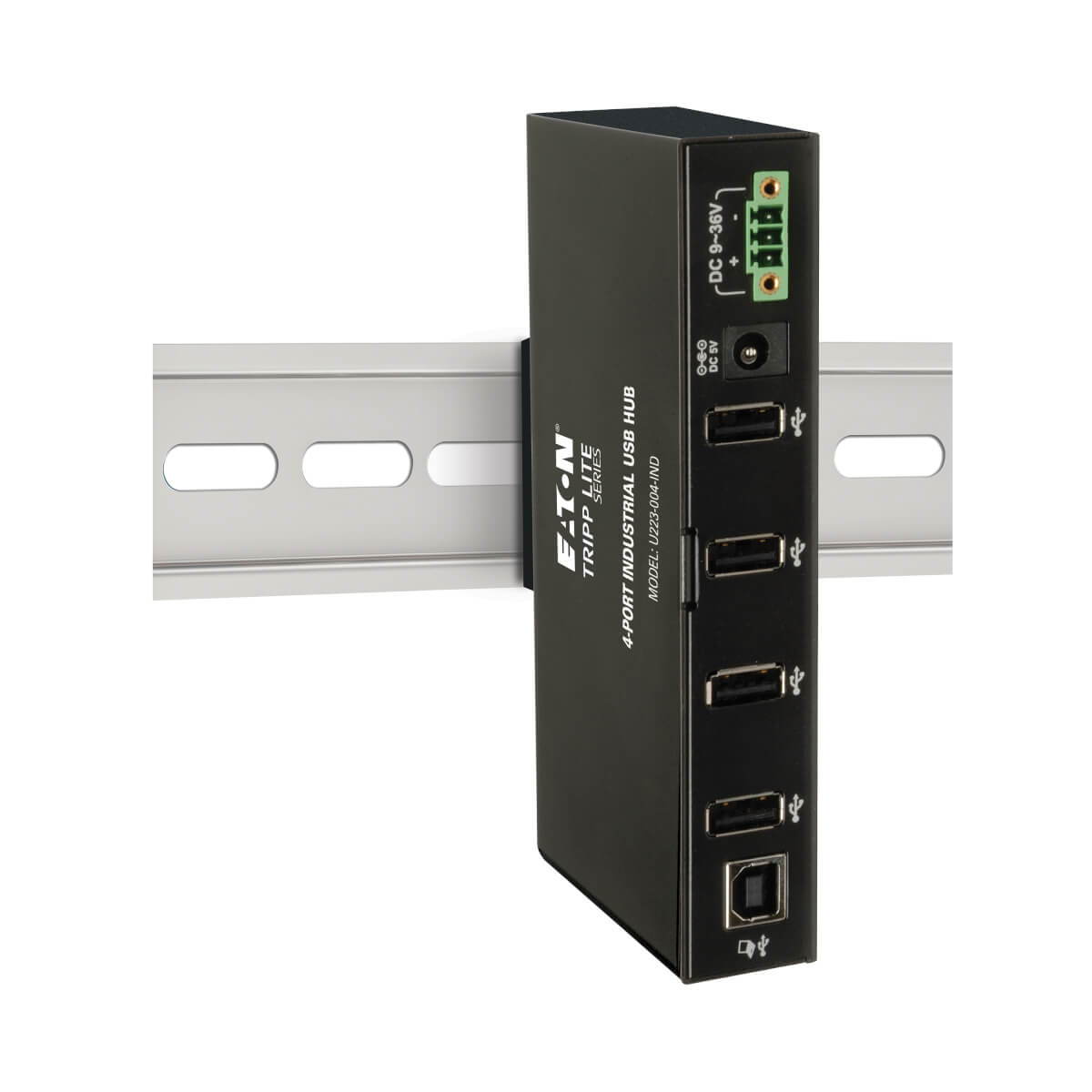 Tripp Lite U223-004-IND. Interfaz de host: USB 2.0, Interfaces de concentradores: USB 2.0. Velocidad de transferencia de datos: 480 Mbit/s, Color del producto: Negro, Material de la carcasa: Metal. Ancho: 139,7 mm, Profundidad: 63,5 mm, Altura: 25,4 mm. Ancho del paquete: 160 mm, Profundidad del paquete: 231,1 mm, Altura del paquete: 76,2 mm. Ancho de la caja principal: 342,9 mm, Longitud de la caja: 480,1 mm, Alto de la caja principal: 386,1 mm