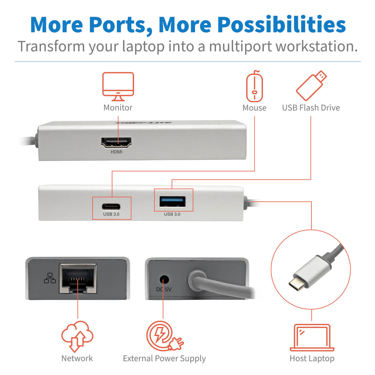 El U442-DOCK13-S amplía el potencial del puerto USB-C o Thunderbolt 3 de su tableta, laptop, Chromebook, MacBook, smartphone o PC. Es ideal para conectar a una red Gigabit Ethernet cableada, transmitir audio digital y video a una pantalla grande, una memoria USB u otro periférico USB y más — todo al mismo tiempo.