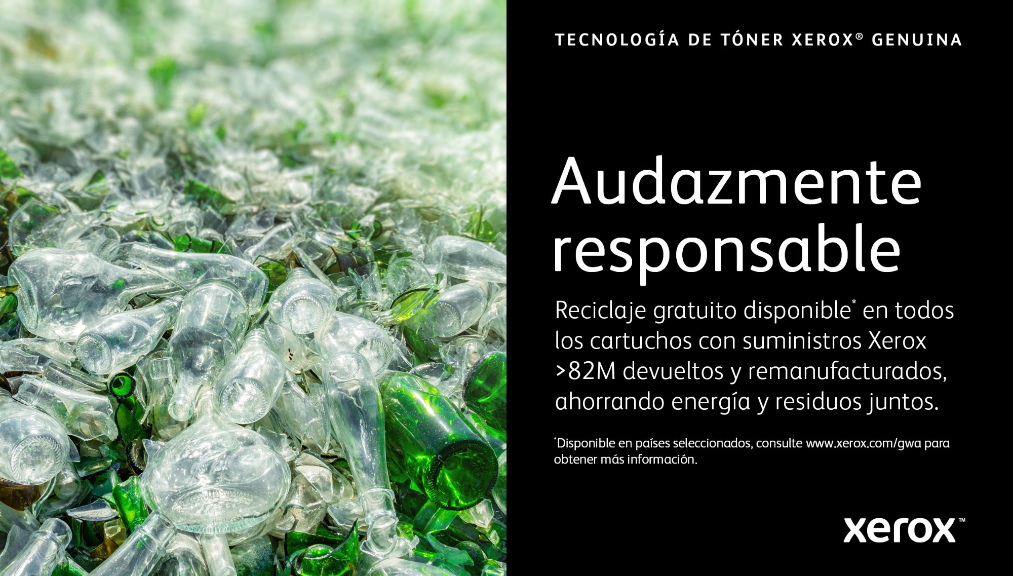 Reciclaje gratuito disponible* en todos los cartuchos con suministros Xerox >82M devueltos y remanufacturados, ahorrando energía y residuos juntos.<br><br>* Disponible en países seleccionados, consulte www.xerox.com/gwa para obtener más información.